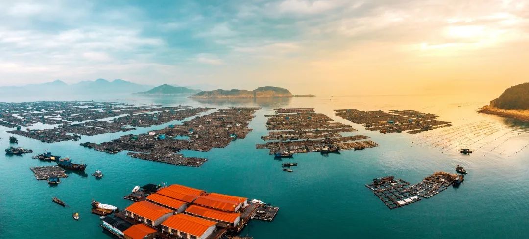 从空中俯瞰,所谓“舟楫为马,海洋为田”,成片的渔排密密麻麻地铺陈在海面上,与海岛、远山共同勾勒出一幅壮美多姿的山海画卷。
