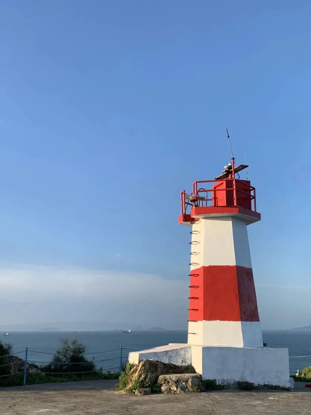 红白相间的灯塔静静伫立于海岛,在碧蓝天空的映衬下亮眼吸睛,默默守护着往来劳作的村民。