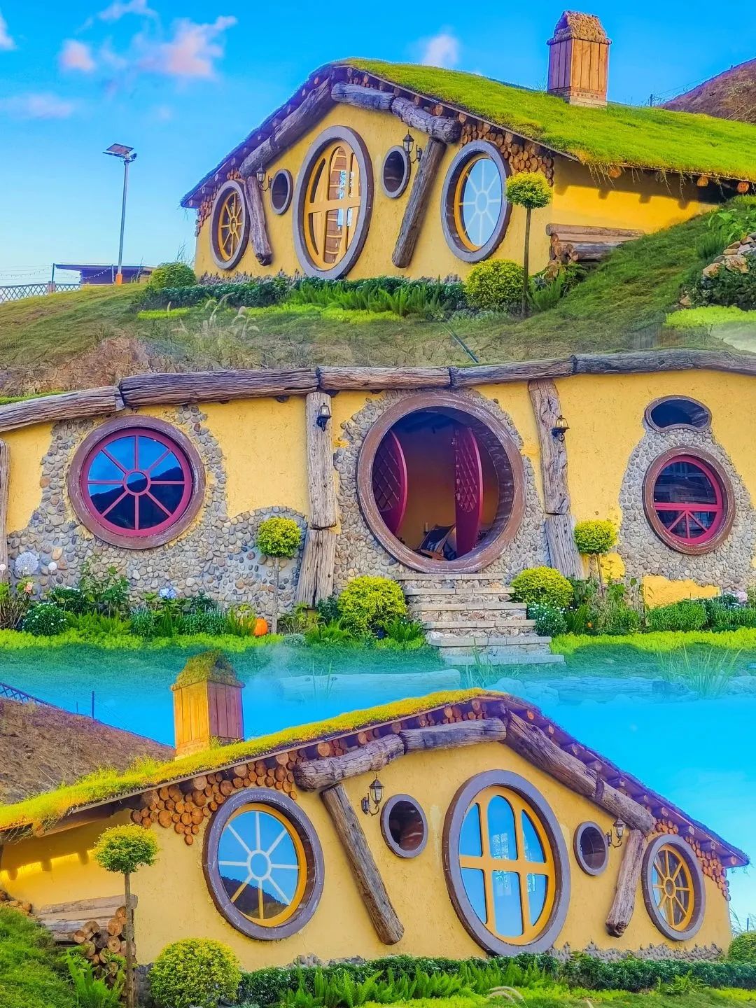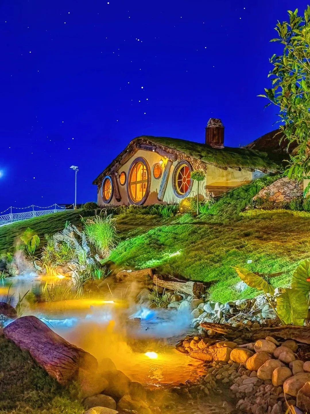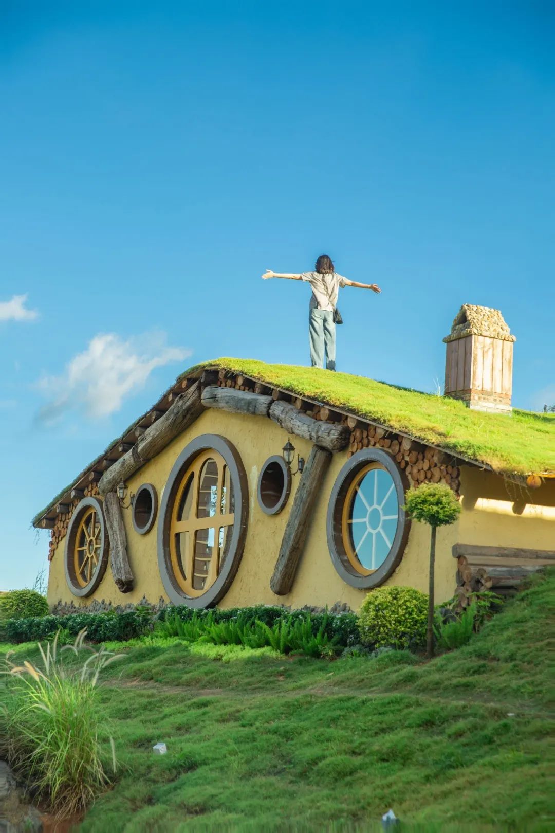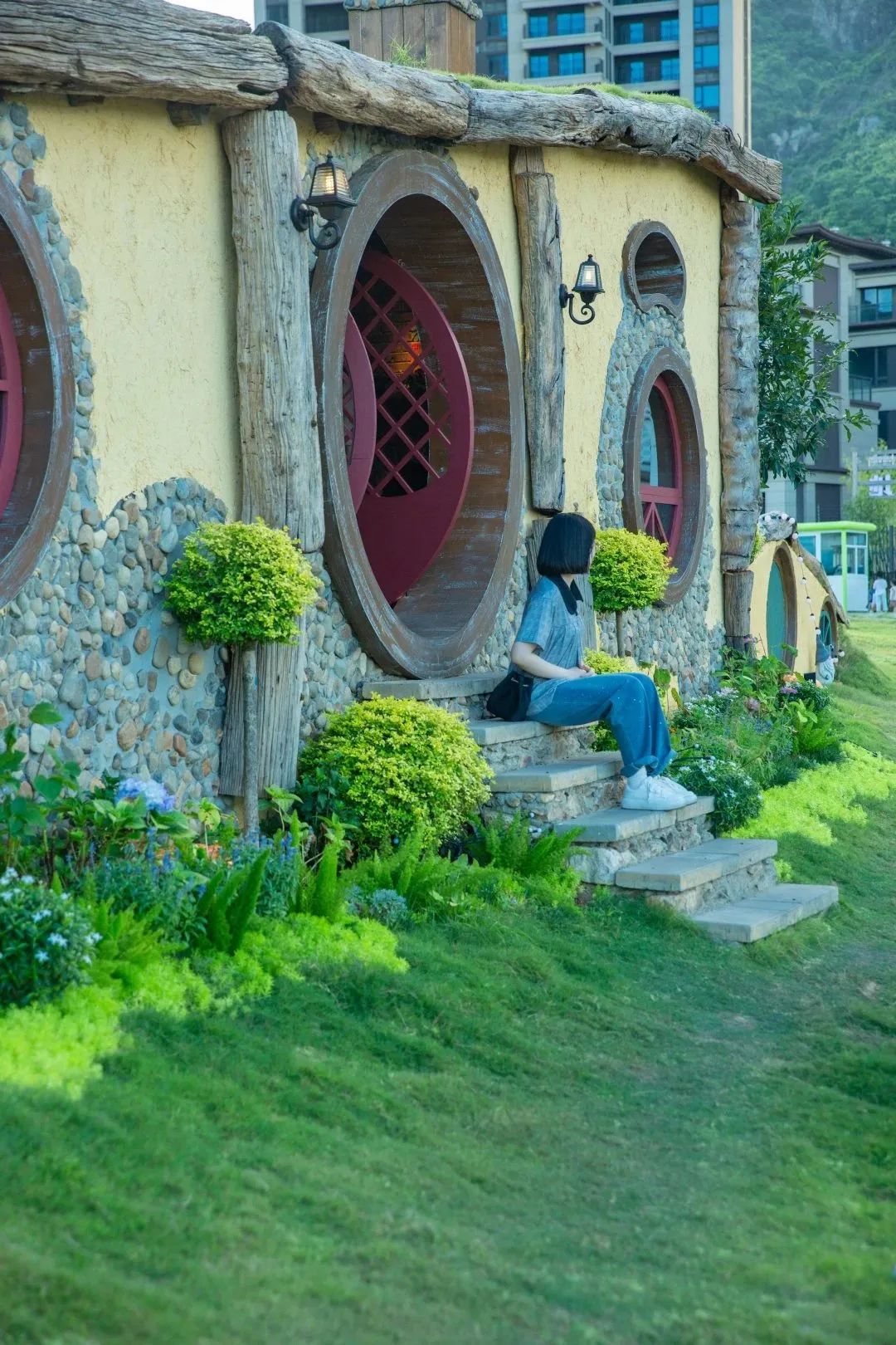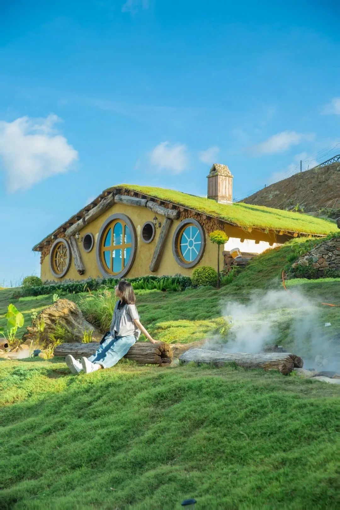 绿意铺就的山坡上是数间精致小巧的霍比特小屋。