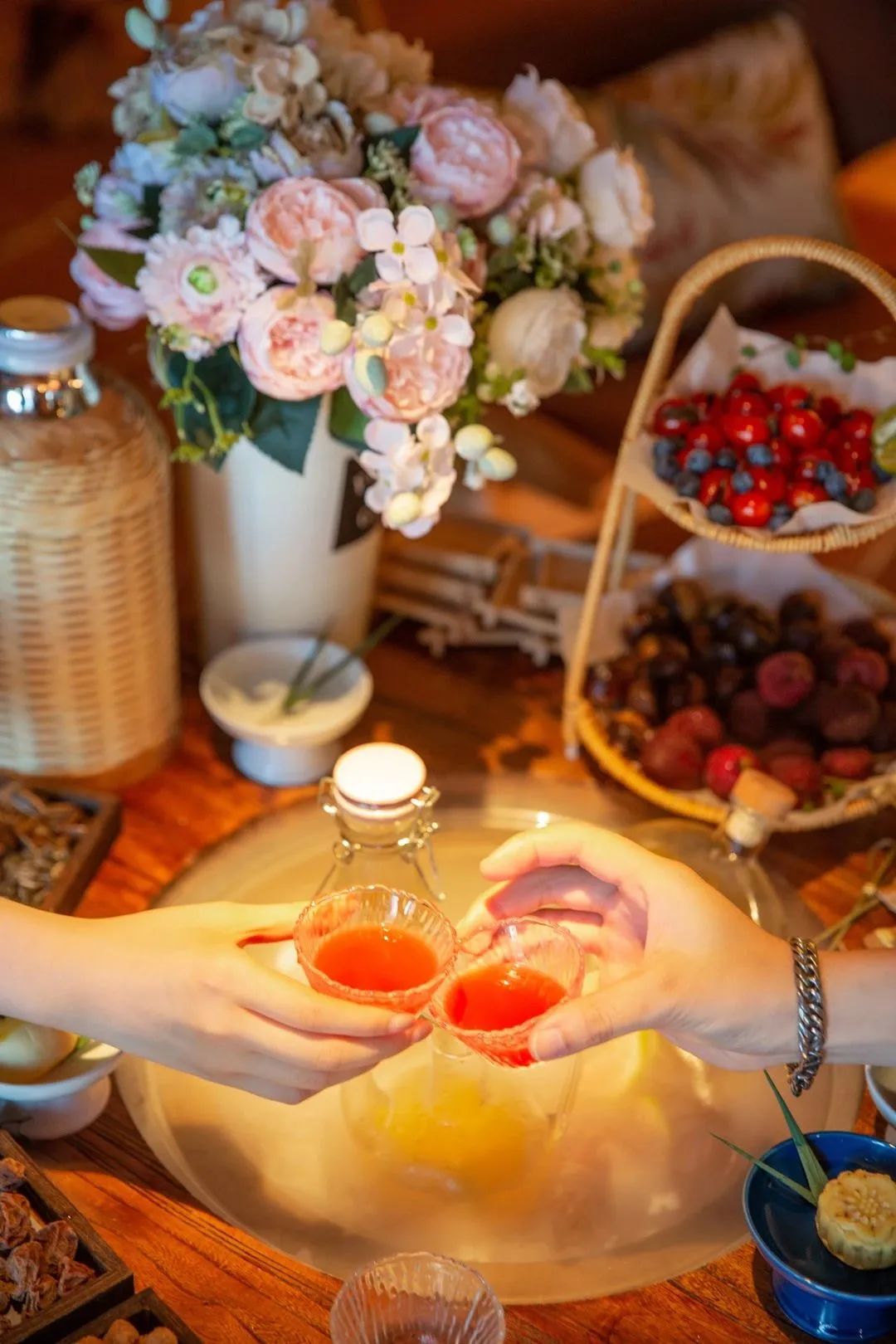 在屋内围炉冰茶,自有一份独属夏日的仪式感。中间是各色冷泡茶,四周摆放果盘、点心等消暑食品,再加上满溢的雾气,仙气缭绕中透出丝丝凉意。
