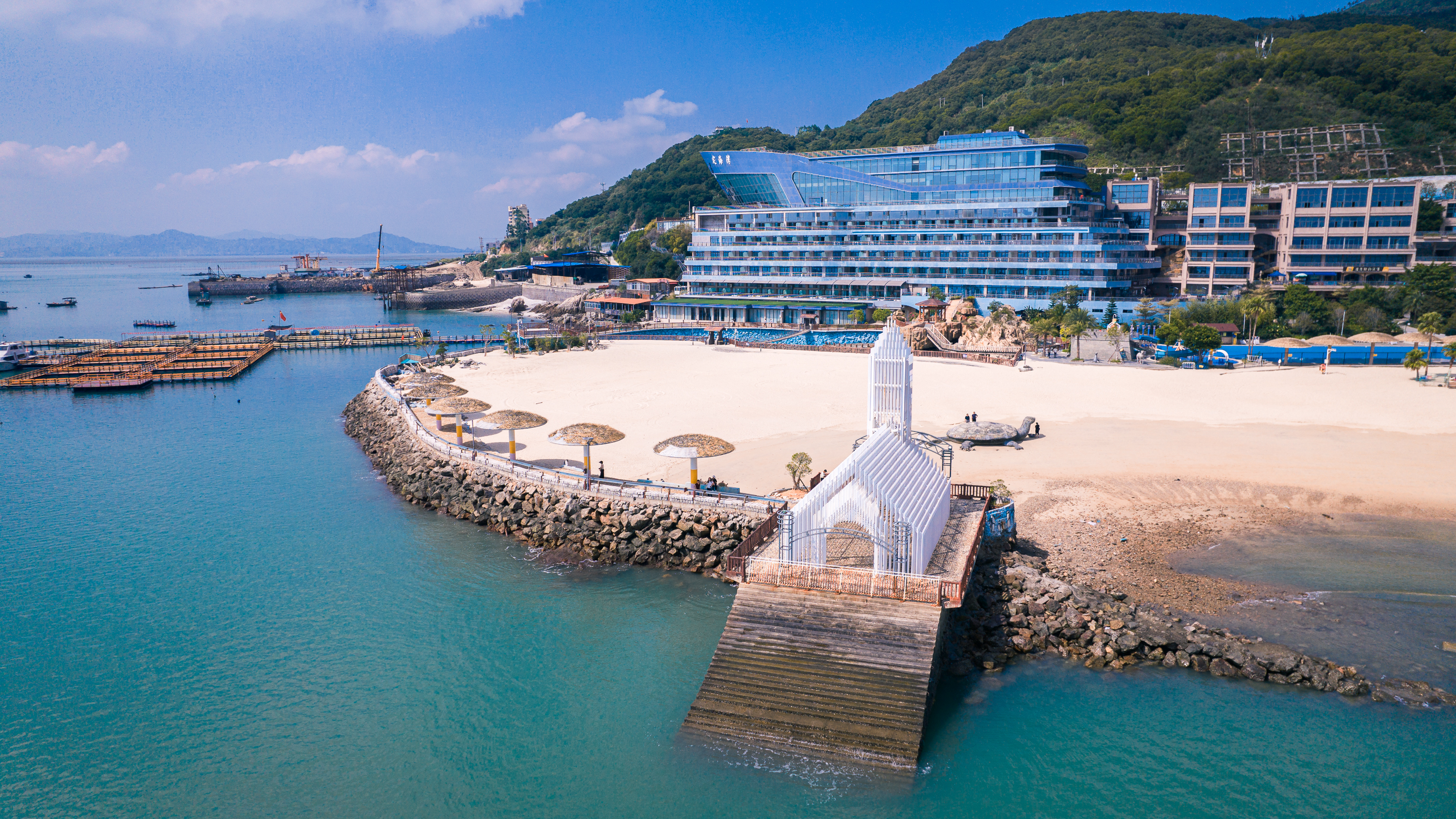 小镇以山地运动和海上体验为核心,主要打造风情沙滩、游艇俱乐部、水上运动基地等为一体的综合性旅游度假村。