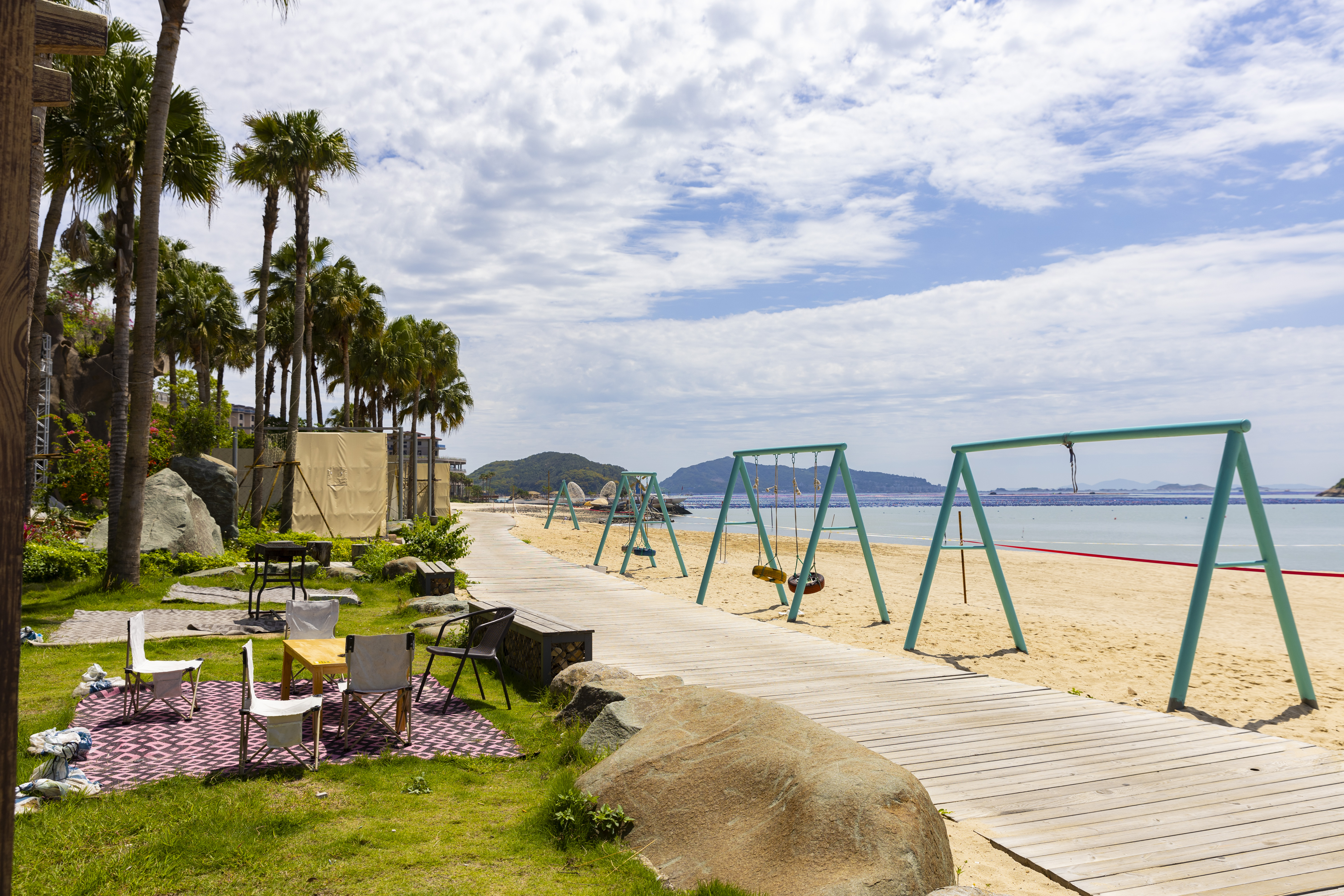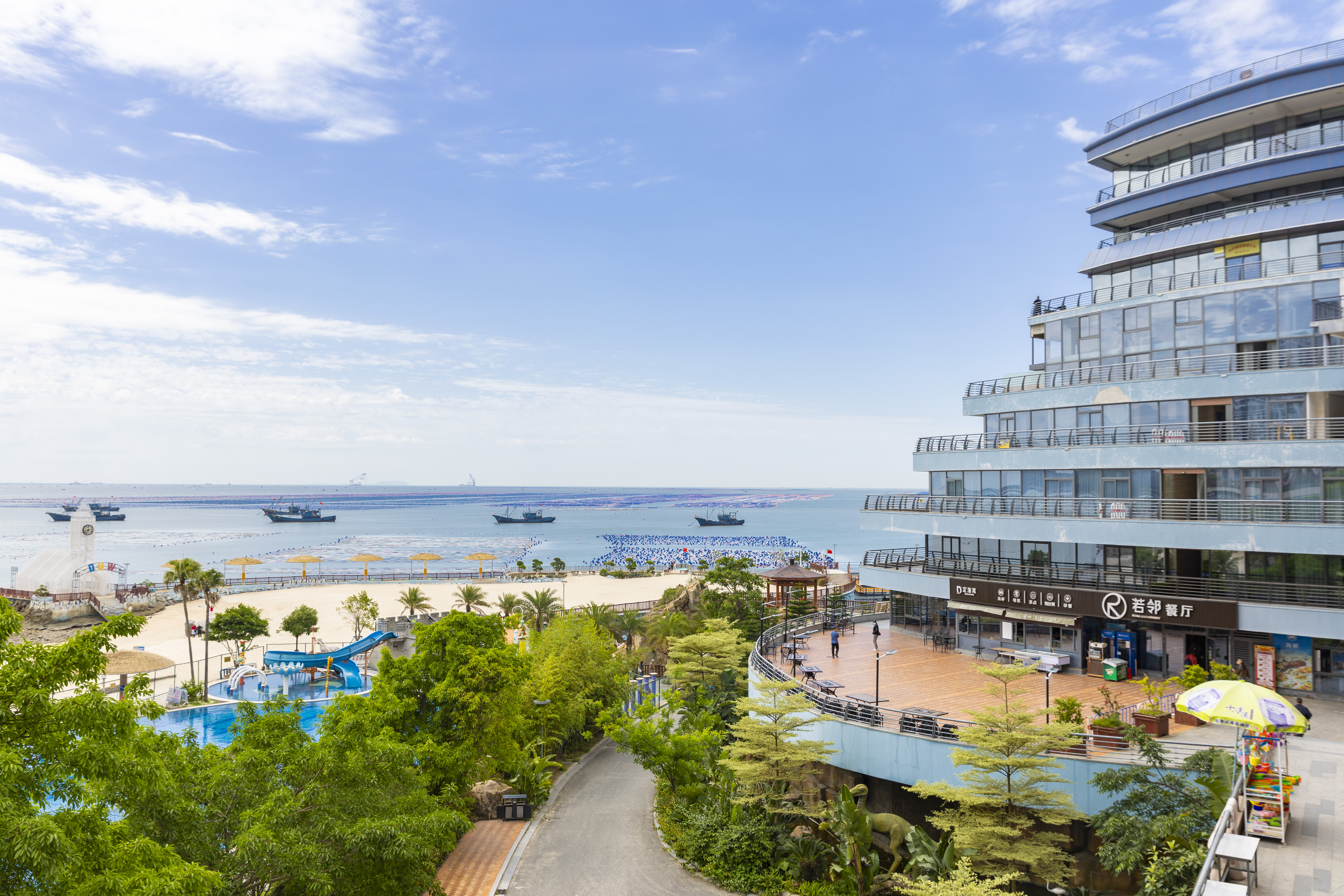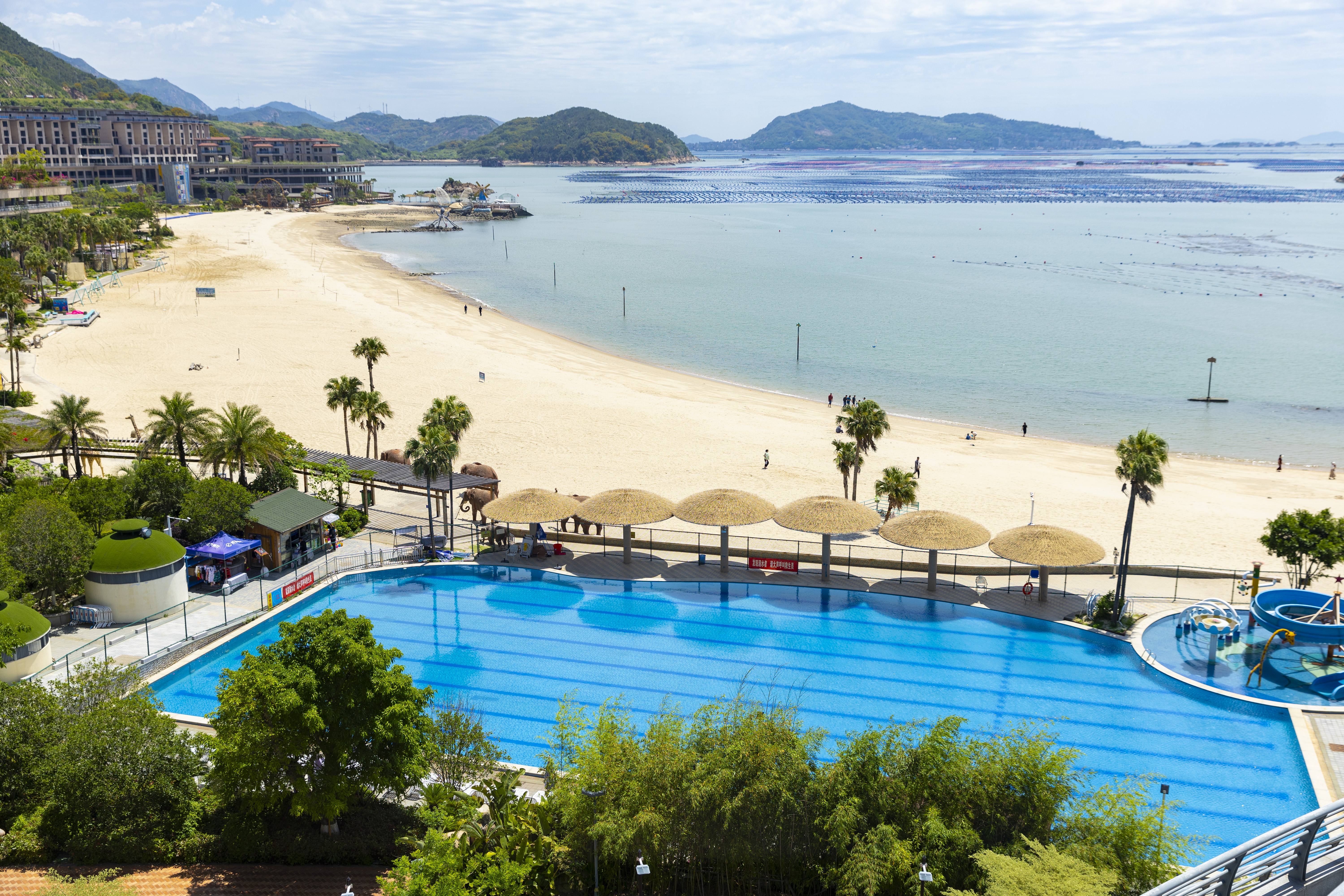 海滩边的棕榈,洋溢着浓浓的热带风情。旁边的海洋动物池,是孩童嬉戏玩乐的好所在。沙滩上还有大象、长颈鹿等诸多动物塑像,吸引众多游人来此拍照打卡。