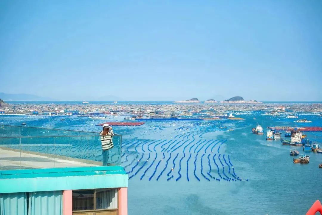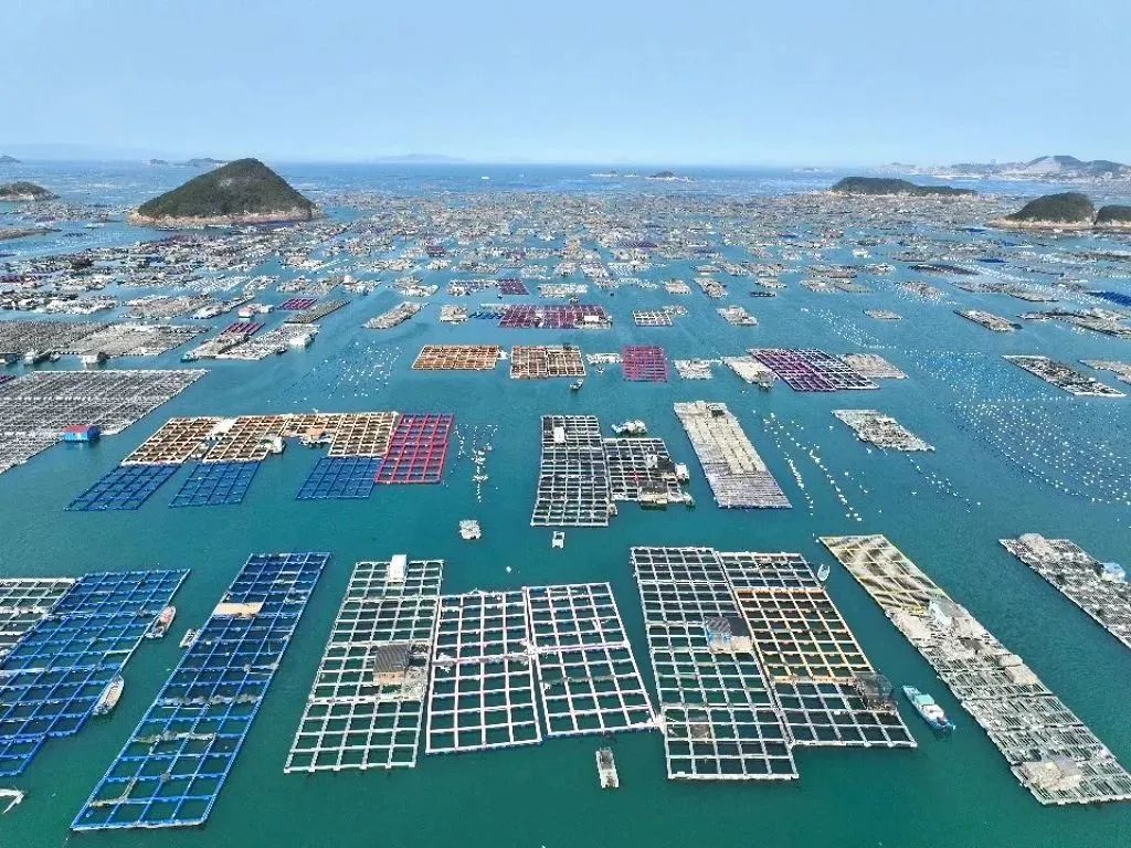 海面上渔排密布,渔田井然,七彩浮球整齐划一,渔船舟楫列队成阵,构成一幅壮观的“海上牧场耕渔图”。