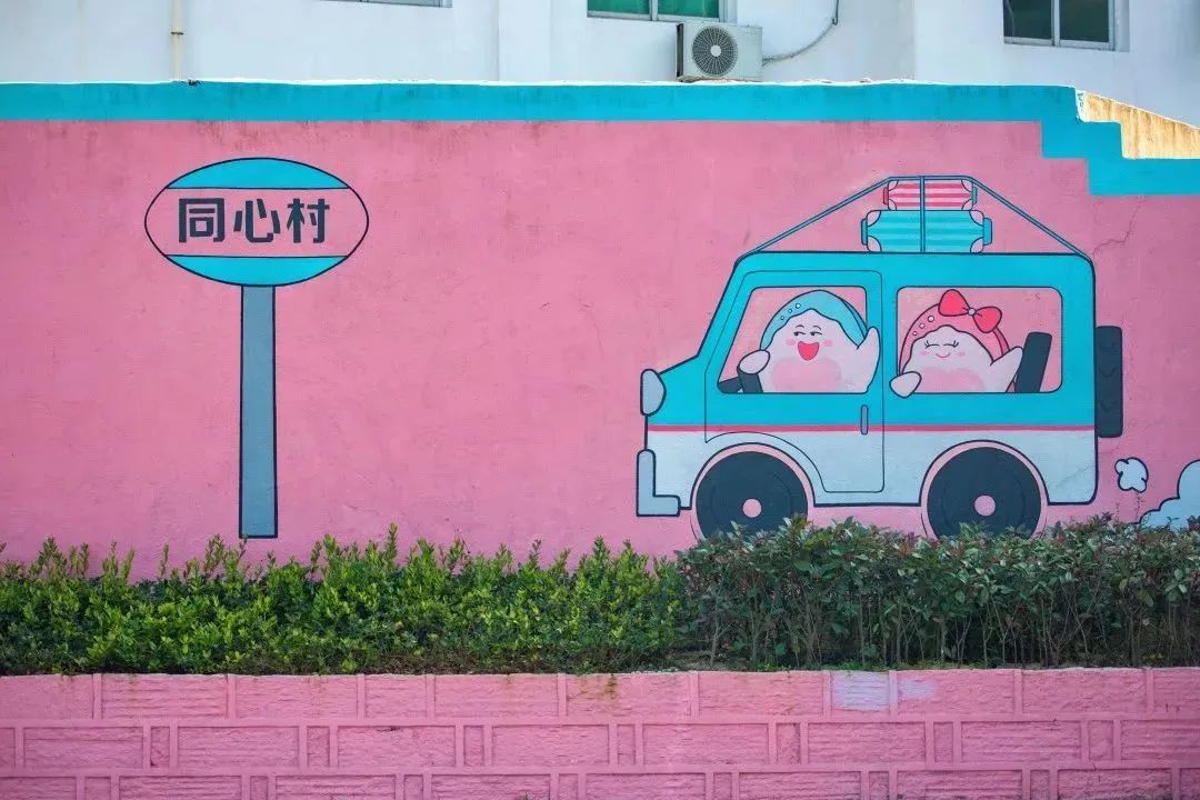 村庄依山而建,房屋错落有致,干净整洁的道路,清新粉蓝的色调,再搭配彩色的卡通墙绘,靓丽的渔村风貌映入眼帘。