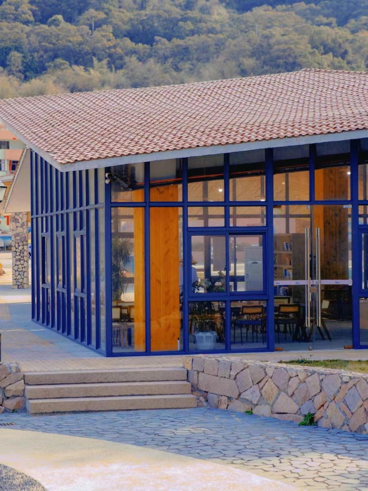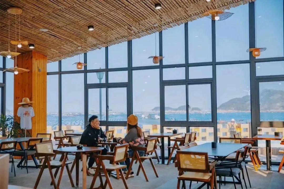 广场旁边有一个名为“鲍美家的海时光”的网红咖啡屋,坐在里面可以看书、聊天、喝咖啡,还可以透过落地窗欣赏海岸无限风光。