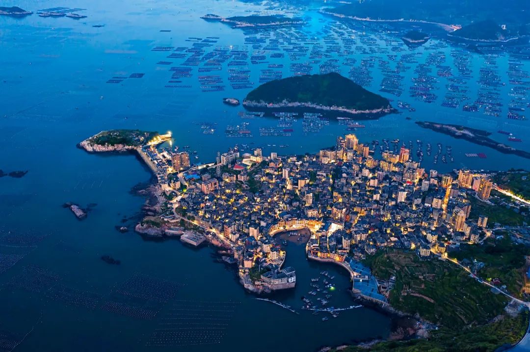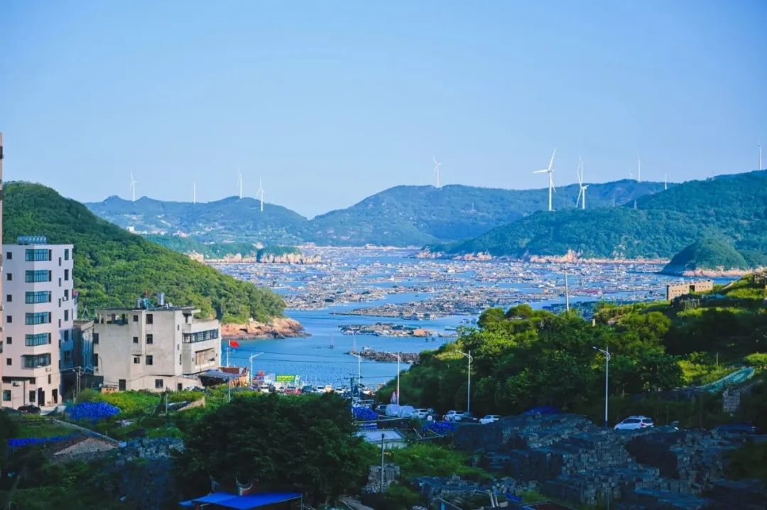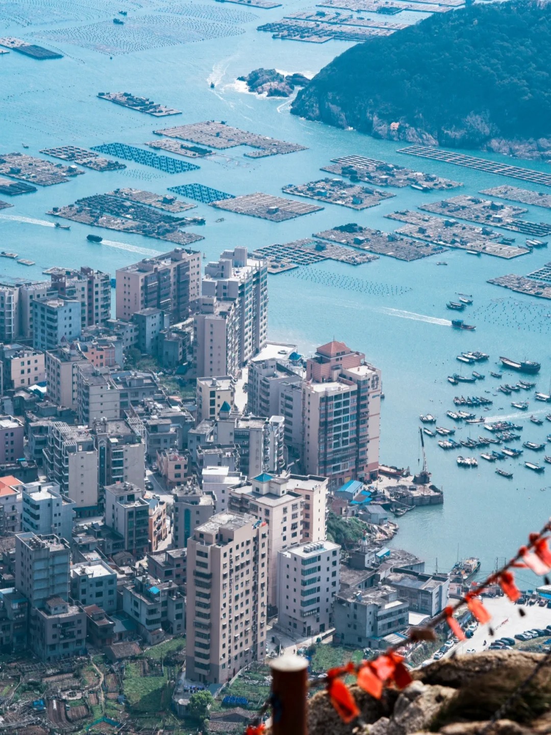 极目远眺,色彩斑斓的房屋,错落有致地分布在山脚,浩瀚无垠的海面上,渔排星罗棋布,网箱规整有序,在阳光下闪烁着点点波光,交织出一幅震撼壮观的渔耕画卷。