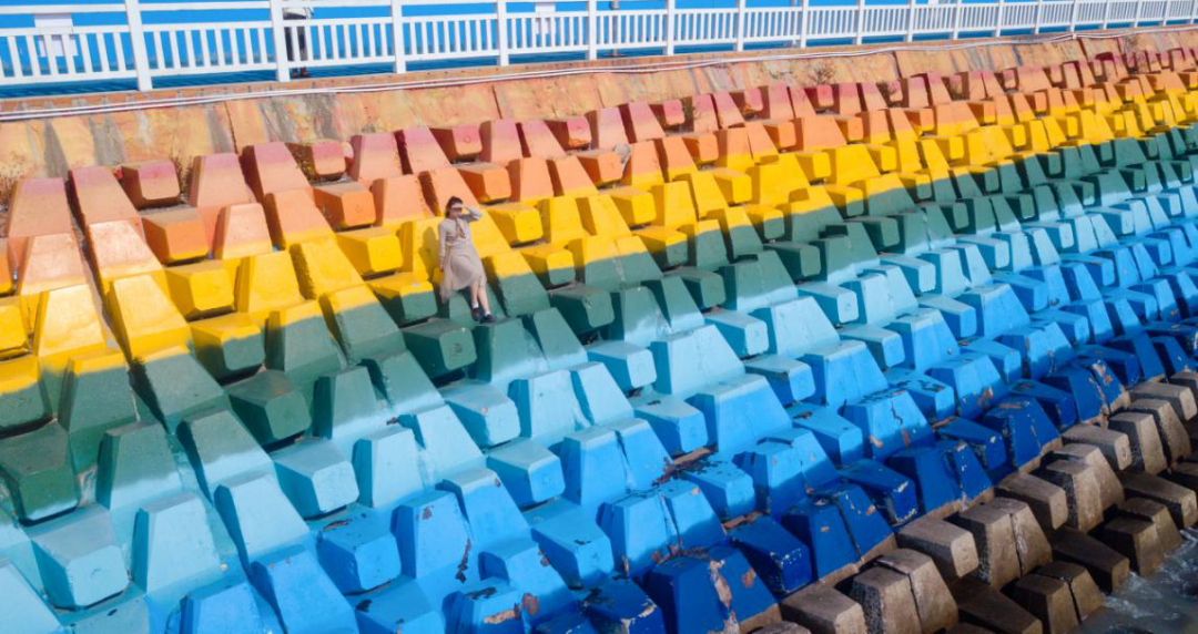 来到渔夫岛,映入眼帘的便是超长彩虹堤坝,彩虹色碰撞蓝天白云极具视觉冲击力,个性鲜明的多彩海岸线加上“彩虹门”“七彩巨石阵““海上钢琴师”等诸多极具艺术特色的场景,就算是海堤也可以玩出不同的花样。