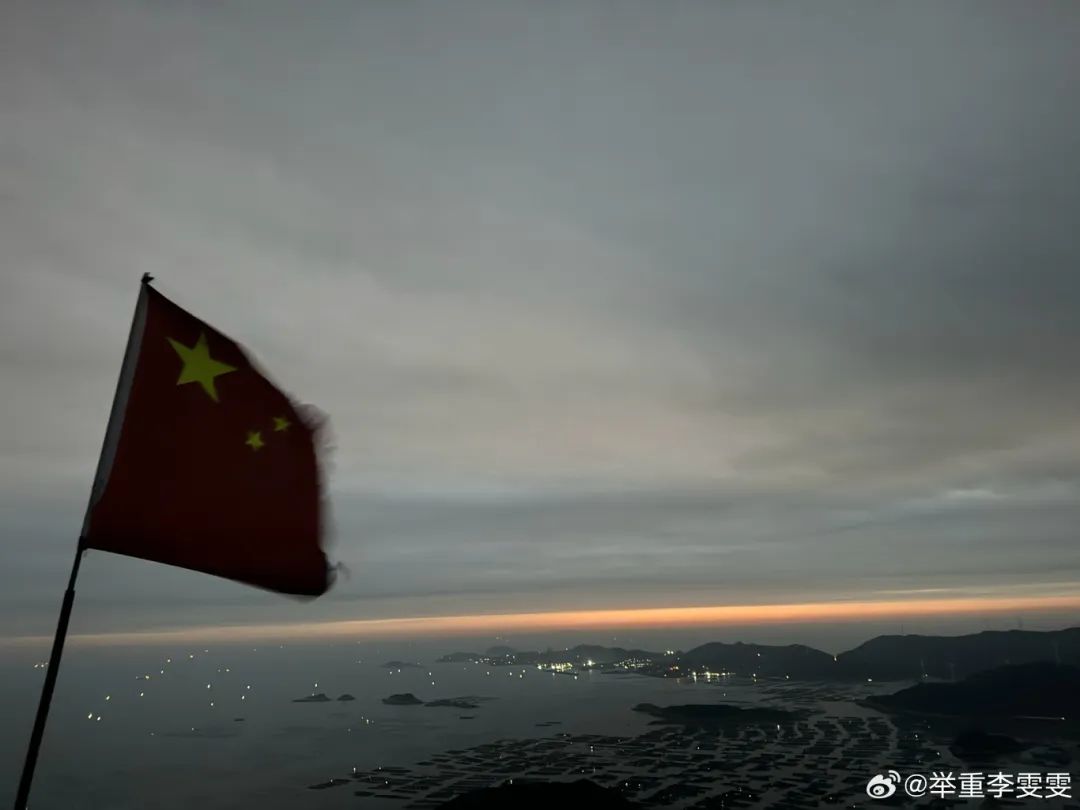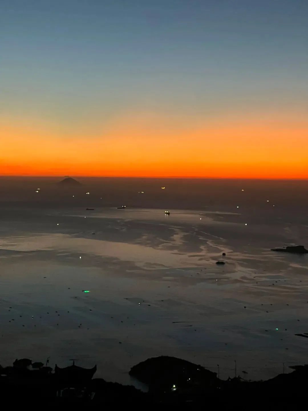 在天蒙蒙亮时,沿着蜿蜒的阶梯,登上旗冠顶,看天边微光初露,薄雾轻绕,渔舟点点,整个海面平缓且宁和。
