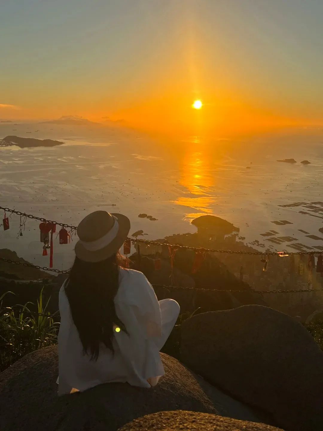 红日跃出,光辉洒向海面,波光粼粼,像是无数颗钻石在海面上跳跃闪烁。坐在顶峰巨石上,看着眼前的一切渐渐变得清晰而明亮,山的灵动、海的蓝调、村的古韵、渔的风味交织出一幅如诗如画的美景。