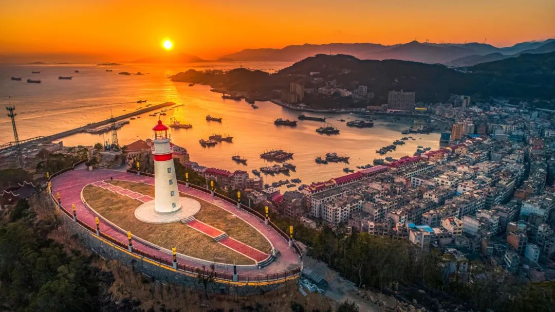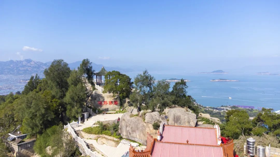 登至顶峰“景泰亭”,放眼望去澄澈的蔚蓝大海无边无际,仿佛与天际相接,密密麻麻的船只停靠港湾,整个画面山海相依,动静相宜,让人不由沉醉其中。