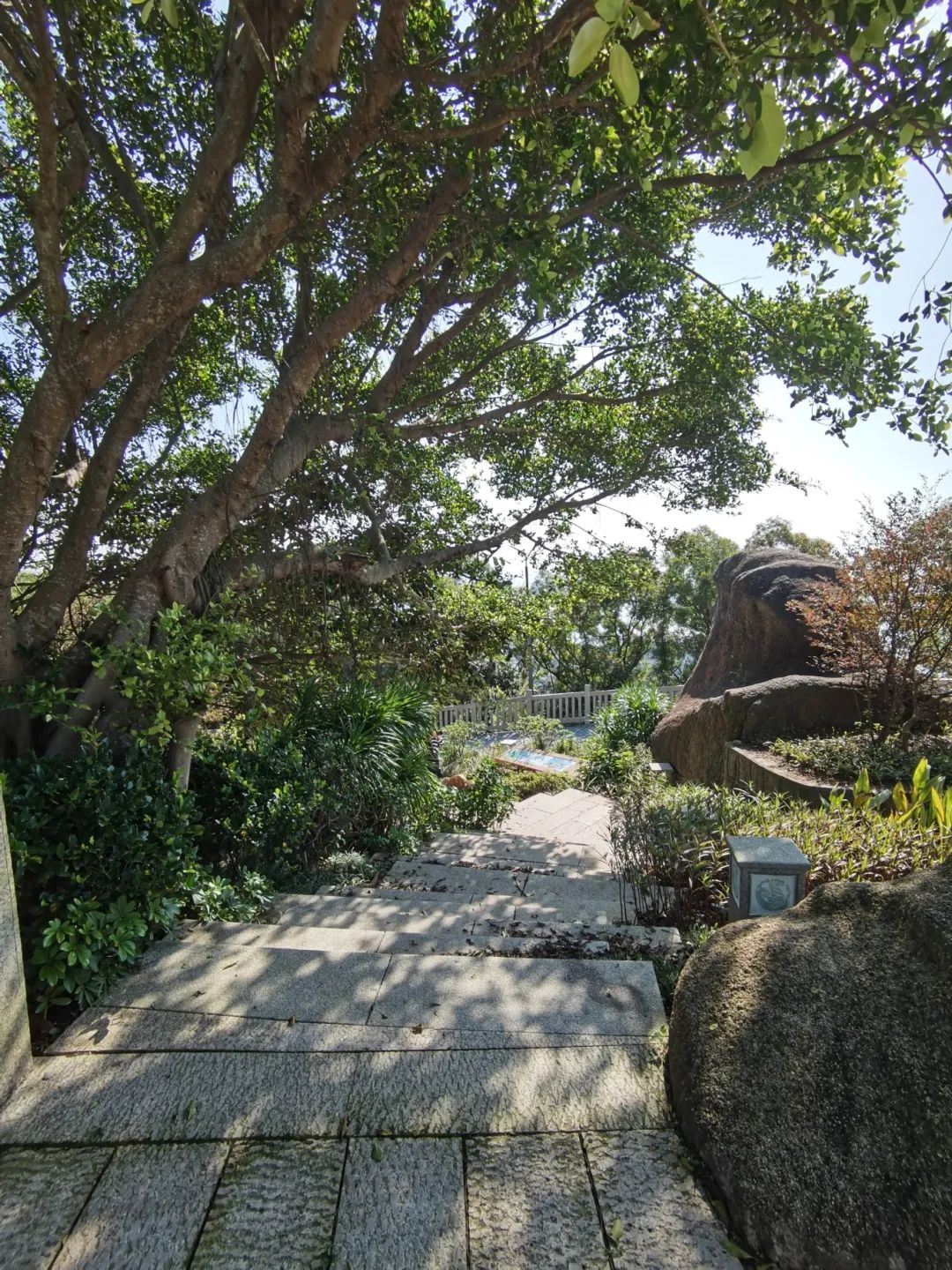 登山步道平坦洁净,只见草木蓊郁、四周静谧而清幽,山风携着丝丝凉意,轻柔地拂过面庞。