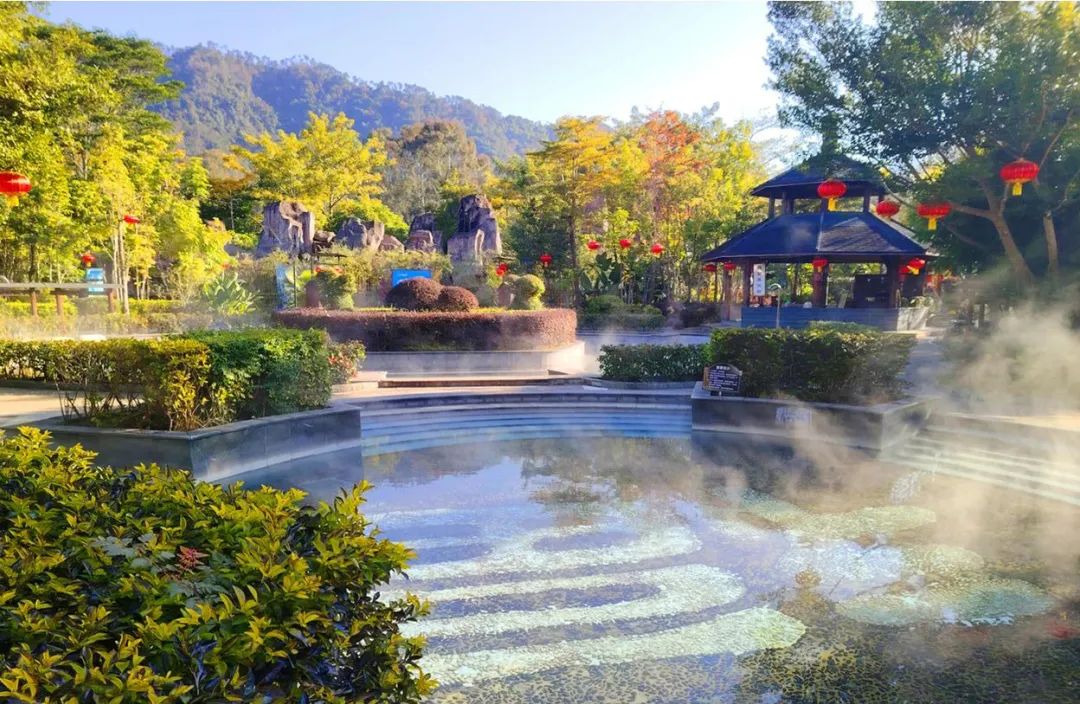 被葱郁青山与繁茂绿树温柔环抱,温暖的温泉水汩汩翻涌,包裹着每一寸肌肤,于水汽氤氲间,惬意地捕捉生活中的松弛感。