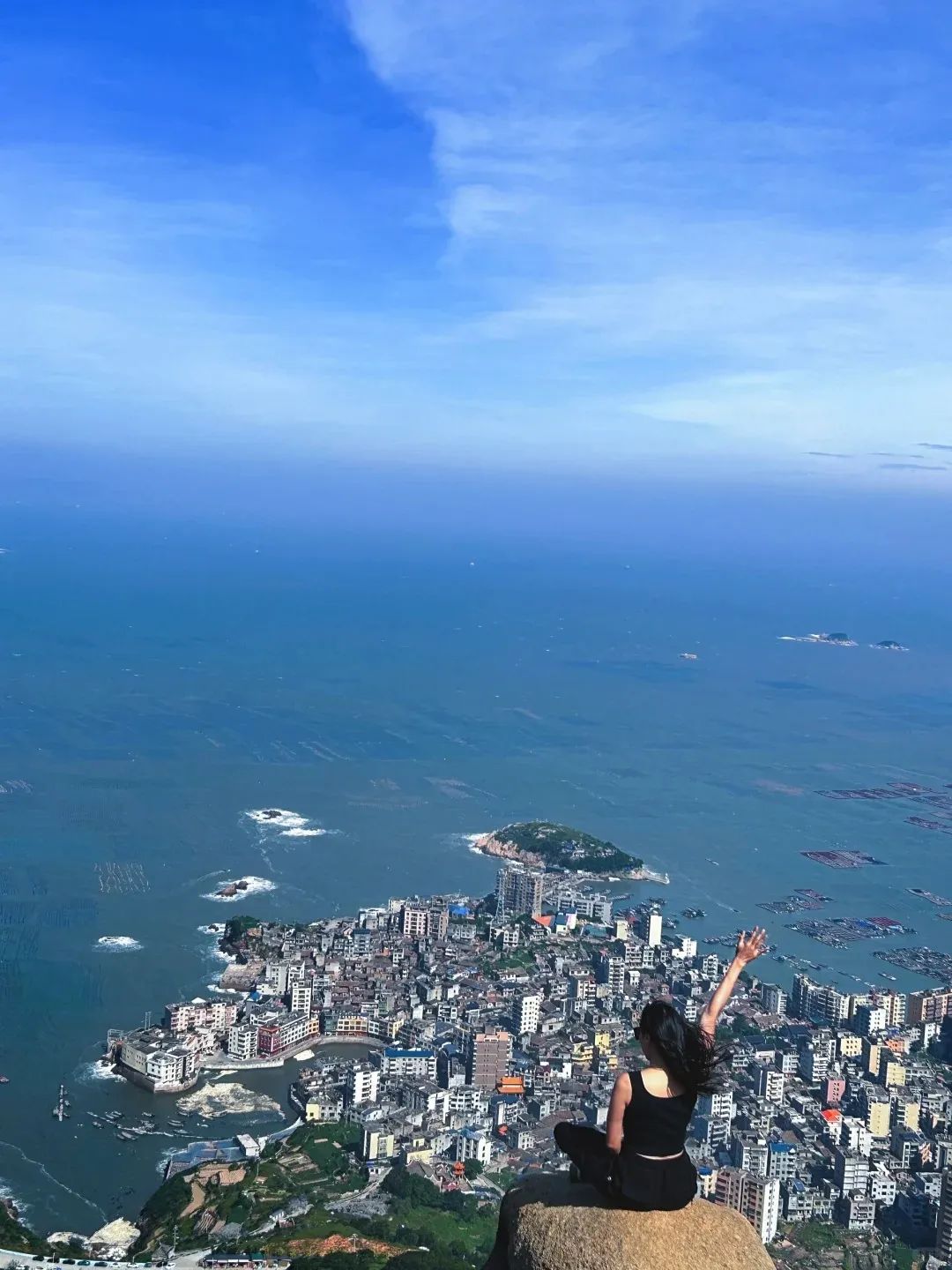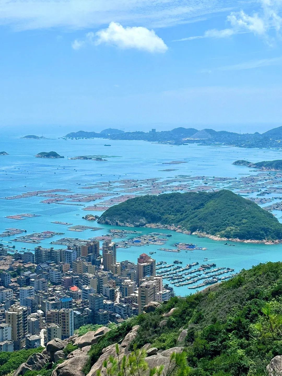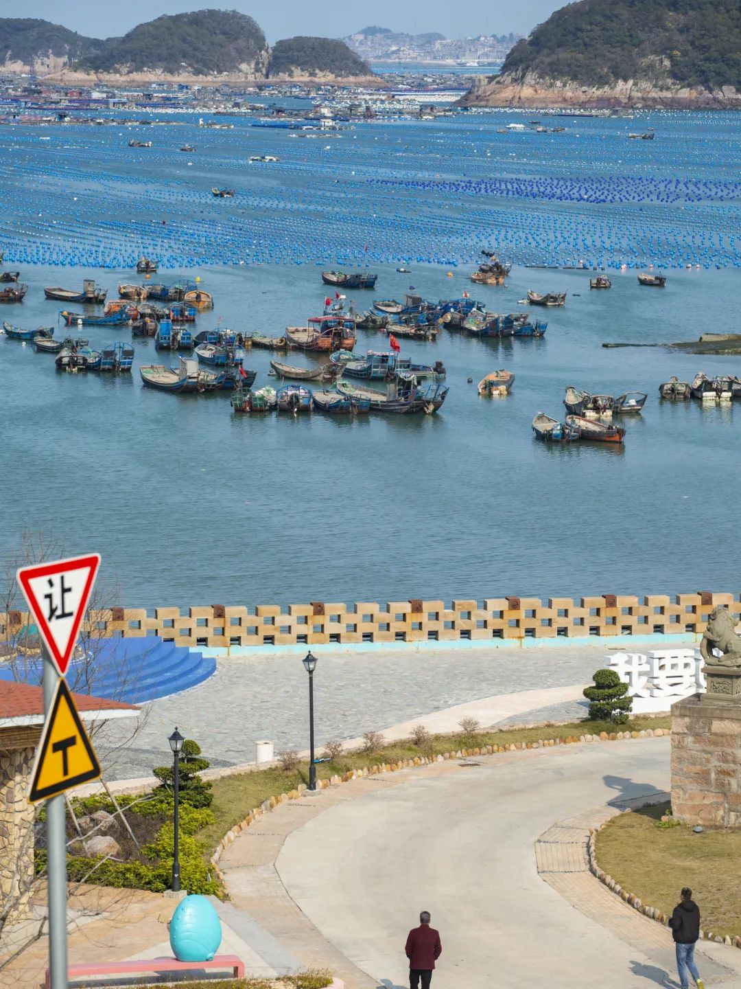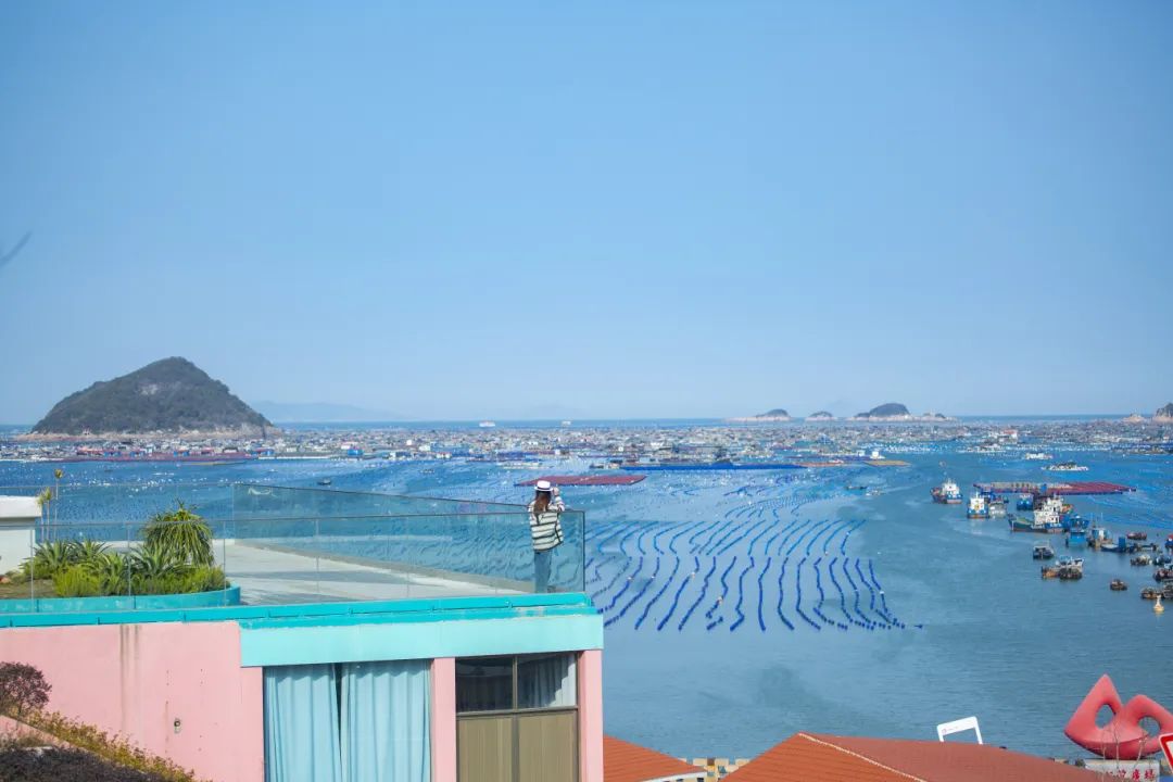 站在村口的平台上,目光望向海面,海上牧场的养殖浮筏整齐排列,随波轻轻晃动,宛如蓝色的琴弦。一艘艘渔船点缀其间,或停泊,或穿梭,渔民们忙碌的身影,为这片宁静的海域增添了几分烟火气。