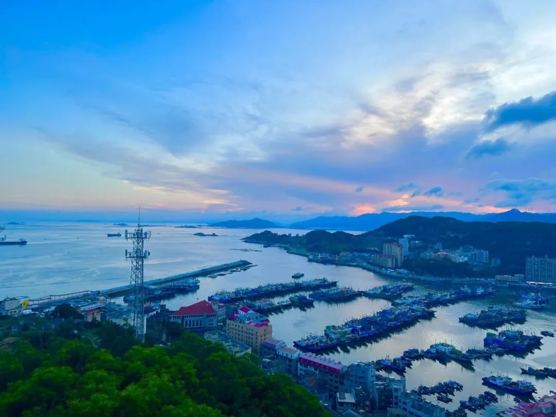 平静的港湾中,无数渔船整齐排列,天空被染成梦幻的粉紫色,远处的山峦连绵起伏,笼罩在一层柔和的暮色之中。
