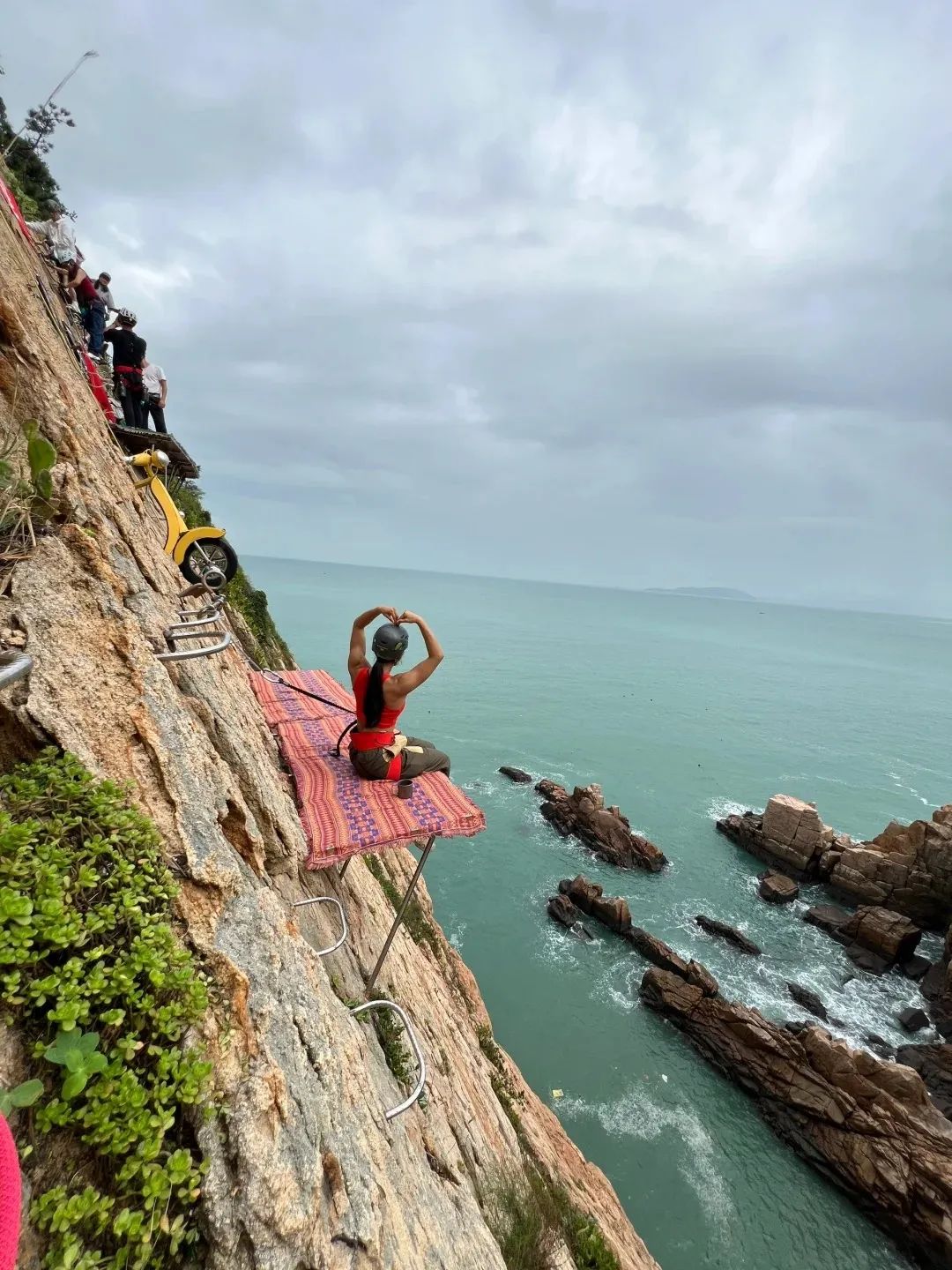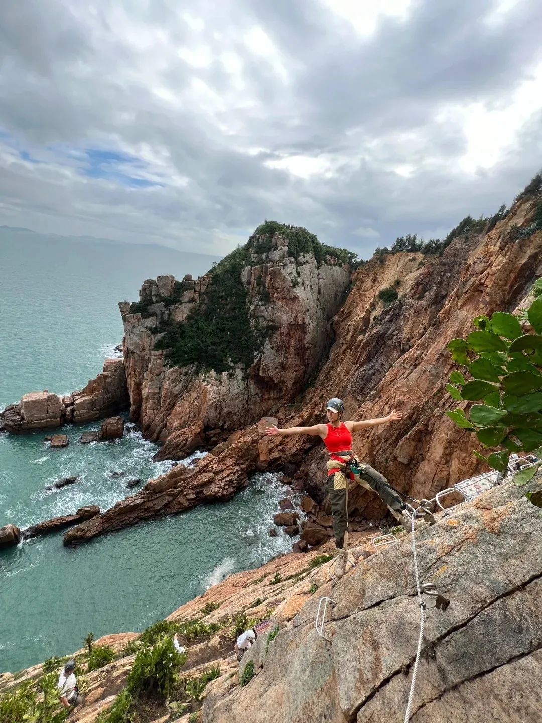 双脚踩在镂空的脚蹬上,耳畔是海浪拍崖的声响,心跳加速,强烈的紧张感油然而生,每一步攀爬都是一次勇气的挑战。