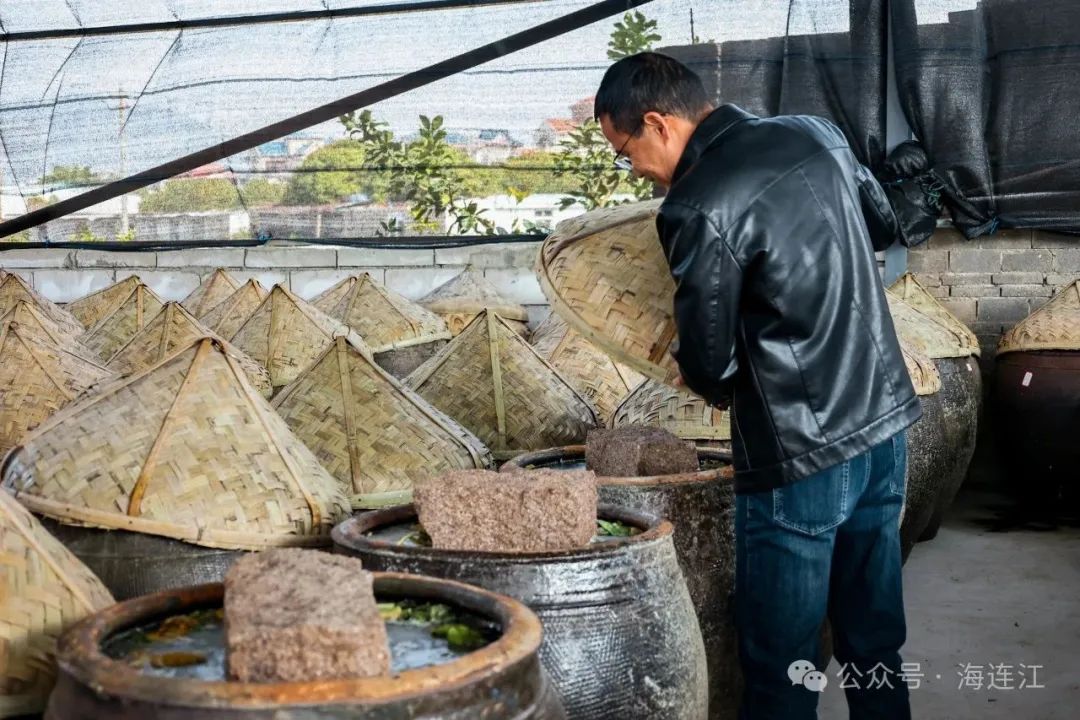 低盐腌制法是连江处理大头菜最常用的方式,将大头菜成串挂起,风干后分离菜头、菜叶,在大缸中摆放菜头,表面铺上菜叶,再压以石头防止松动,最后根据一定比例,倒入浓度约为10%的盐水淹过菜叶,腌制一个月左右,就能制成独具风味的大头菜。