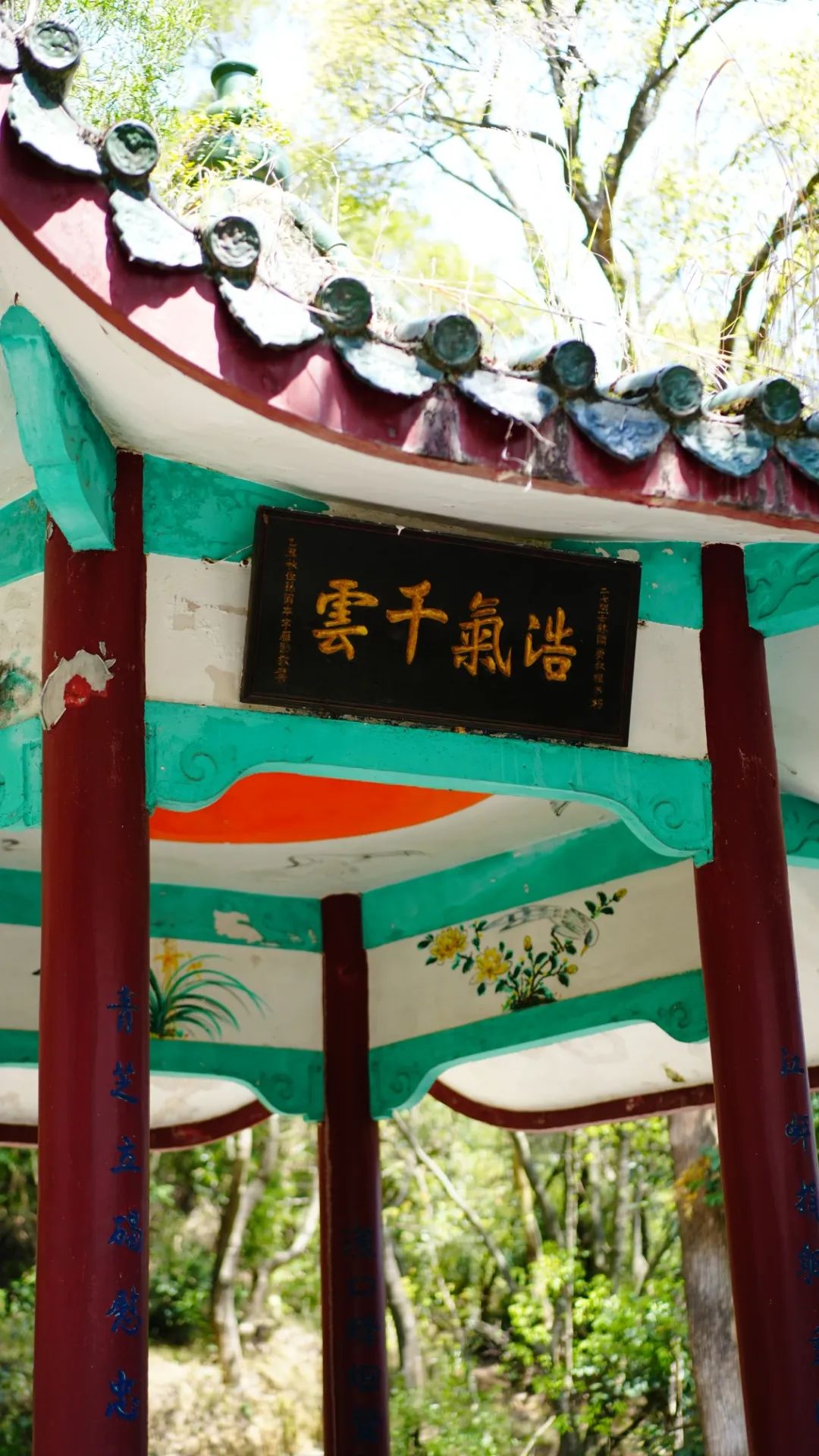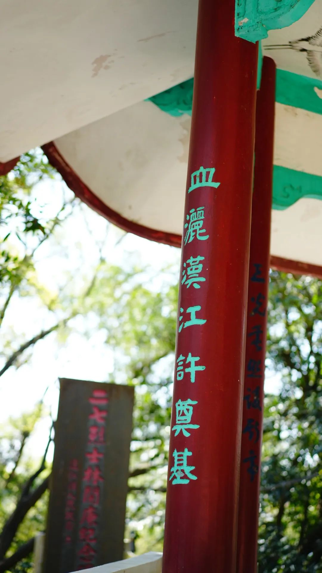 亭柱之上,“碧血染红汉江水,丹心照亮赤县天”“汉口烽烟惊敌胆,洞山浩气壮忠魂”“开运先声输碧血,庚华挥发献丹心”“魂归百洞留怀古,血洒汉江许奠基”“百洞钟灵归拱屿,三光垂照扩斯亭”“江岸捐躯垂国史,青芝立碣慰忠魂”等联句笔力雄浑,意蕴深长,倾注后人对烈士光辉一生的高度赞誉与深情缅怀。
