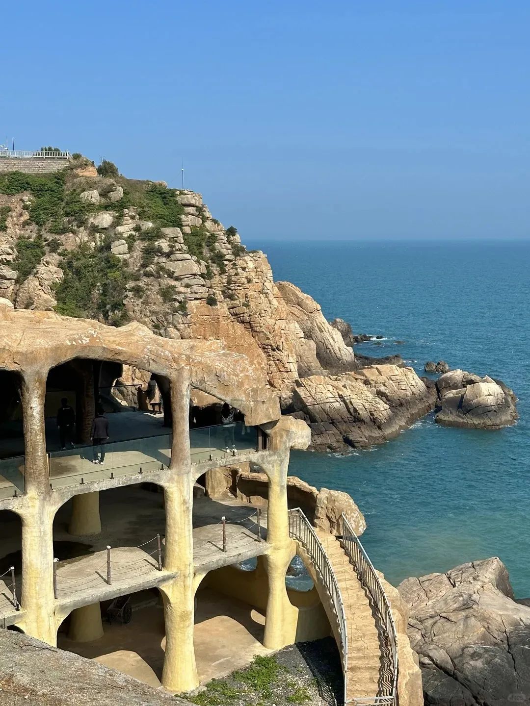 临崖建筑仿若从奇峻巨石中生长而出,独特的造型与碧海蓝天相映成趣;