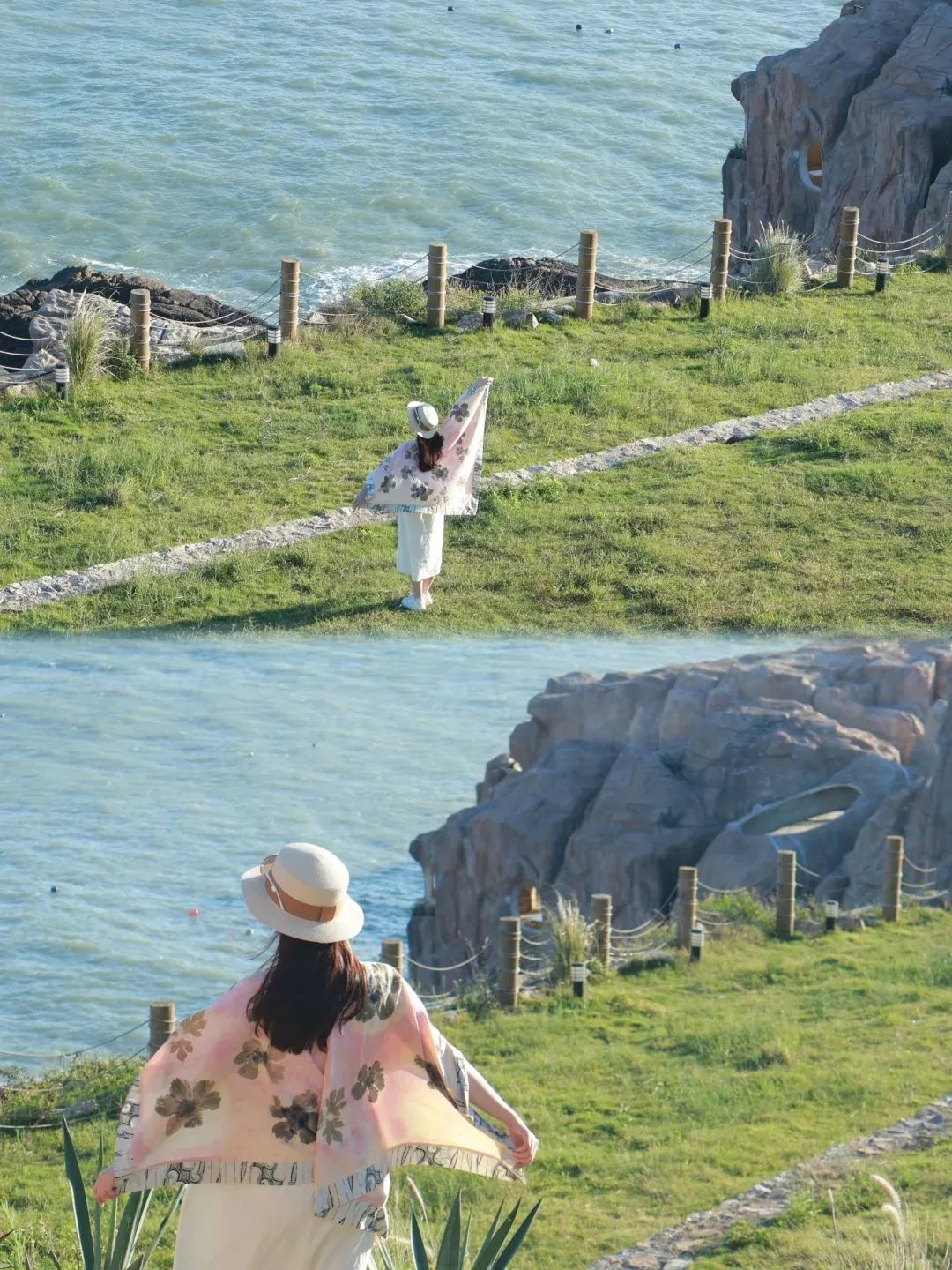站在草坪之上向海挥手,任海风轻拂发丝,定格氛围感海滨背景照;