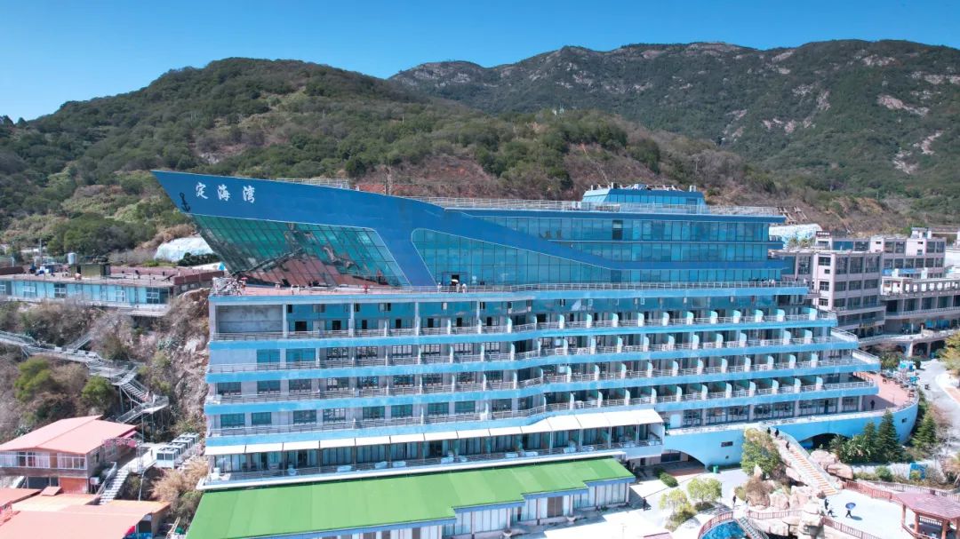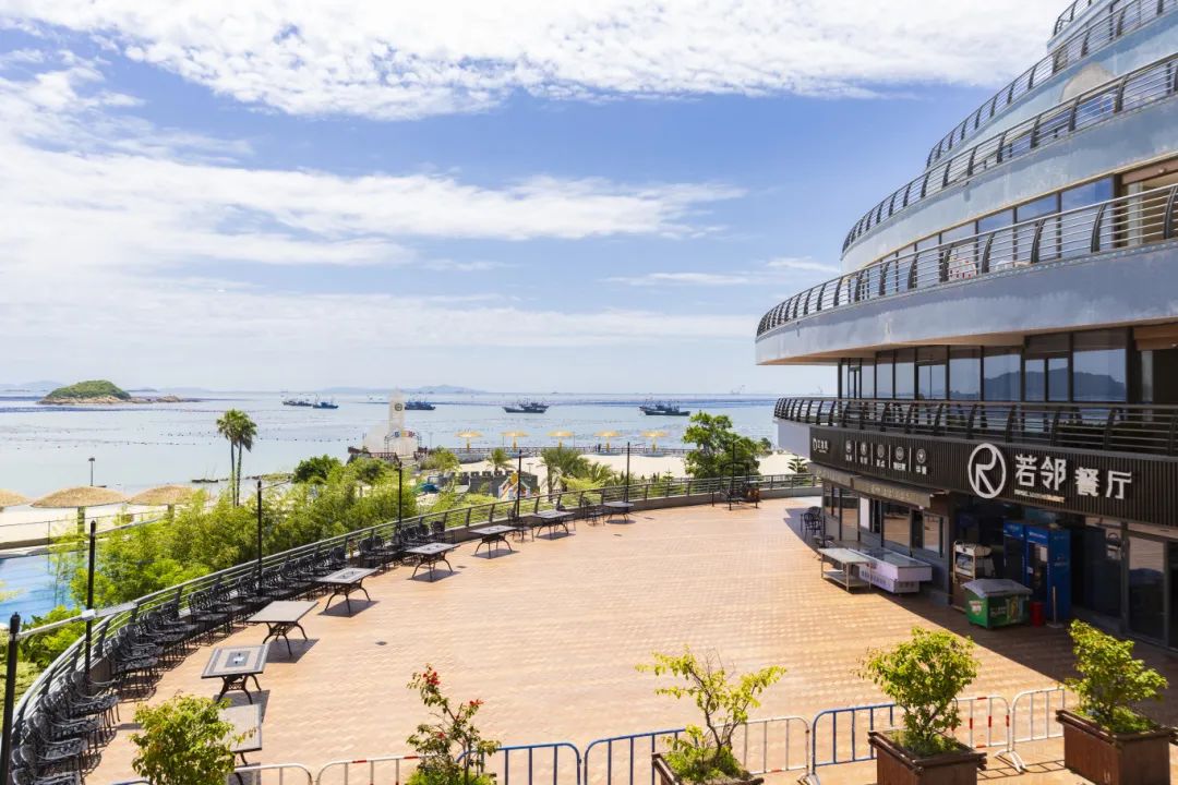 巨轮造型的游客服务中心,是定海湾的标志性建筑,藏在“船舱”里的若邻餐厅,让人一边品尝海鲜大餐,一边透过玻璃窗欣赏海天一色。