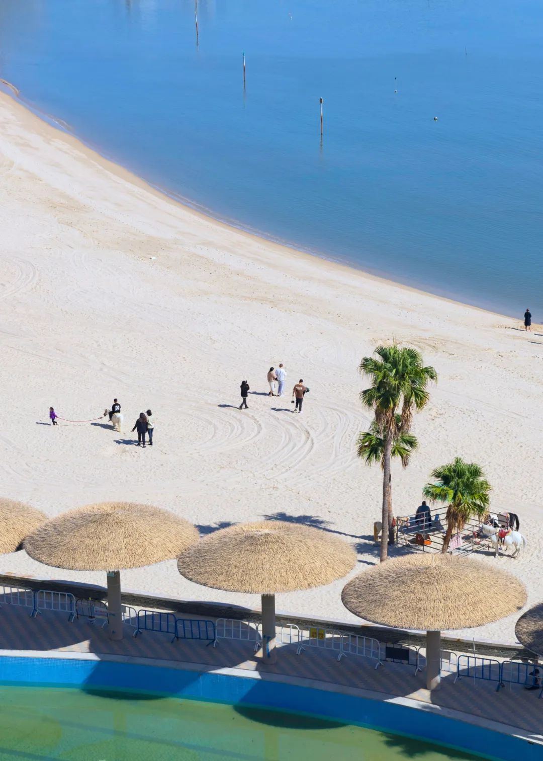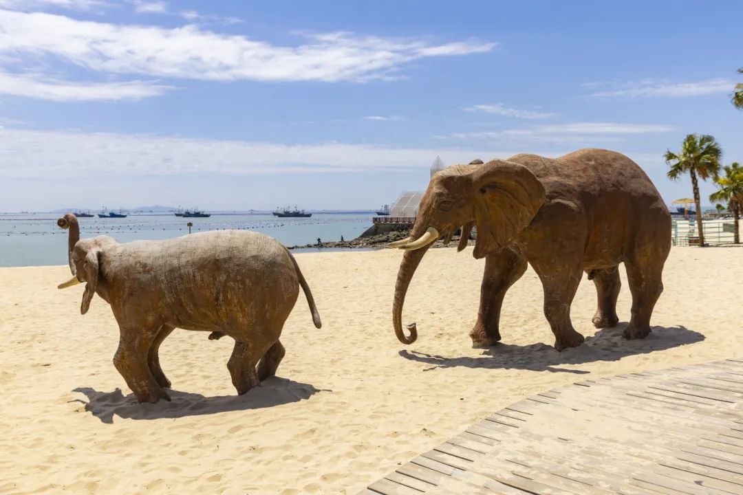 孩子们举着小铲在沙堆里“寻宝”,城堡与隧道在他们手下逐渐成型;大人们或在遮阳棚下享受海风轻抚,或打开相机与岸边的白色城堡、动物雕塑合影……不同年龄的人都能在这片海湾找到自己的游乐方式,勾勒出鲜活的海滨图景。