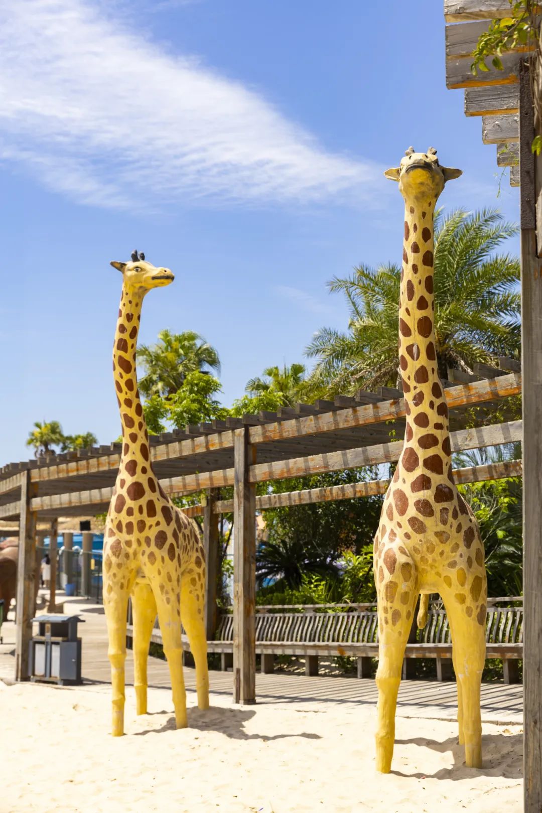 沿着楼梯往下走,沙滩上摇曳生姿的棕榈,与萌趣的海龟、大象、长颈鹿等动物雕塑一同营造出热烈浓郁的热带风情。