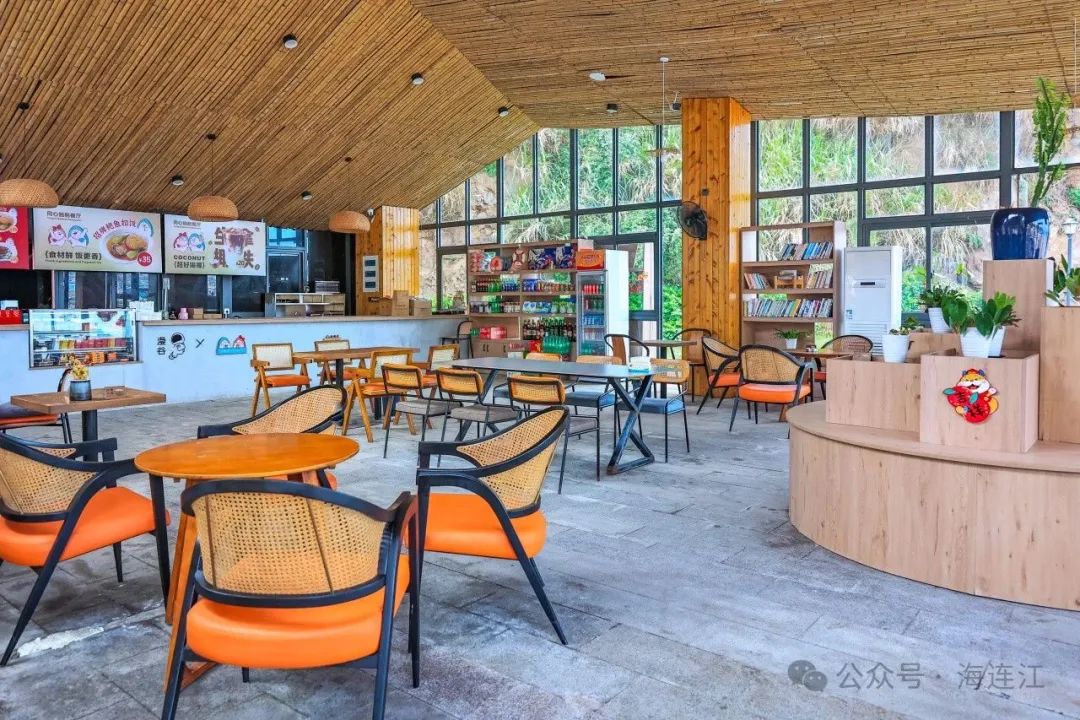 暖橙色的沙发与原木桌椅清新靓丽,通透的玻璃窗将无垠海景框成画卷,在这里和家人一起品咖赏景,便是生活中暖暖的小确幸。