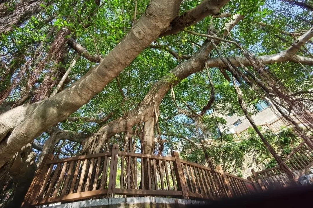 循着村道慢行,千年亭角公园里近两百年的古榕亭亭如盖,是纳凉休憩的好去处。