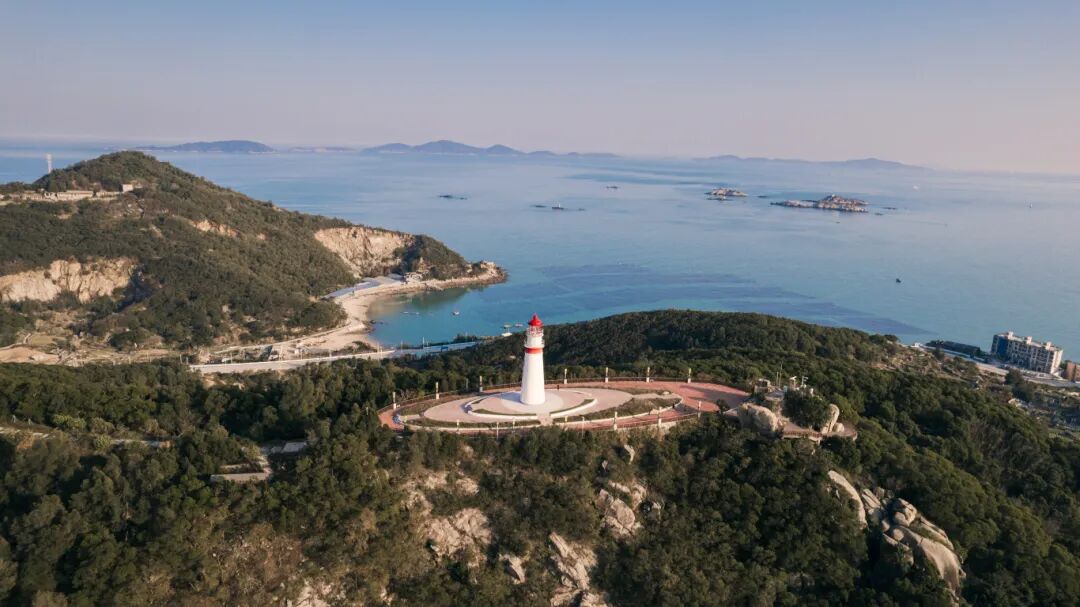 红白灯塔、青山风车、渔帆大海相映,动静皆成画