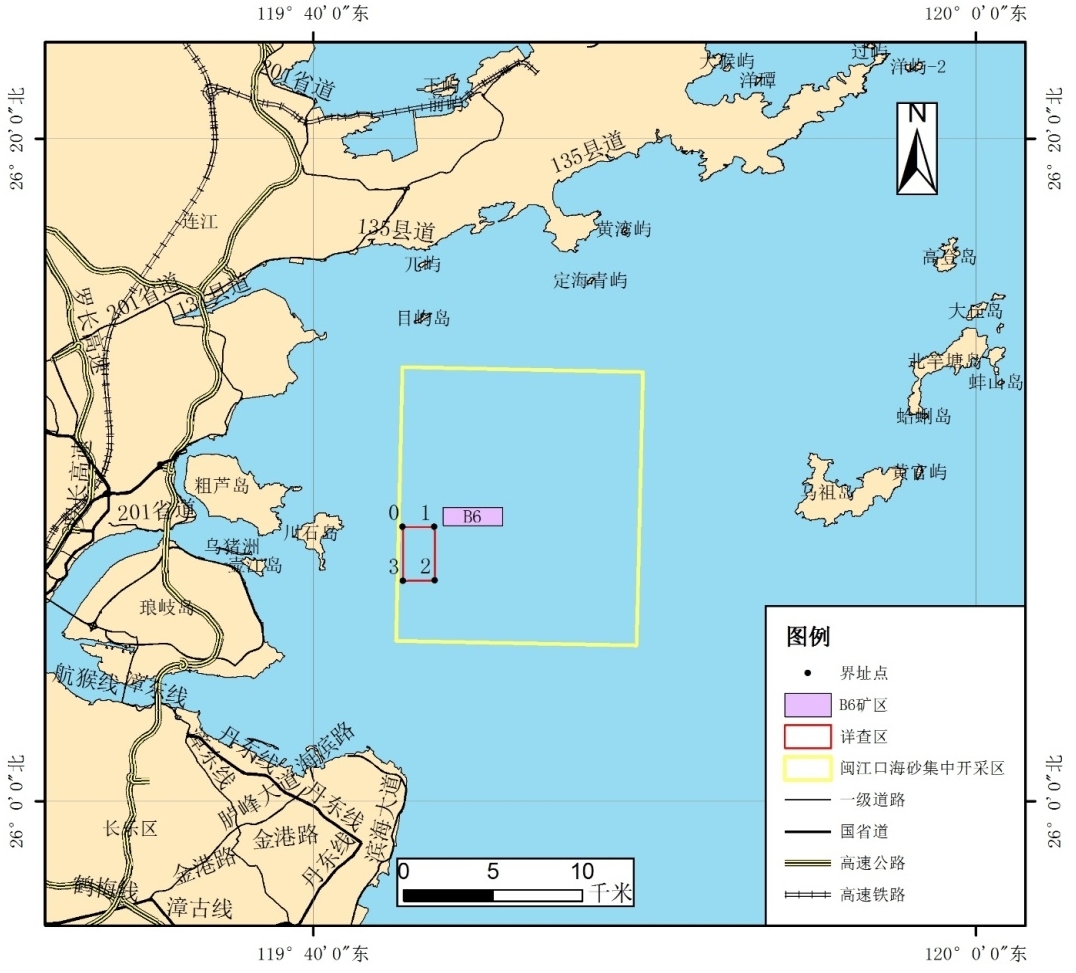 (2)建设地点:位于连江县琯头镇川石岛东侧海域,在粗芦岛以东约6km,川石岛以东约3km,毗邻福州闽江口海域B6矿区南西侧。具体地理位置如图1所示。