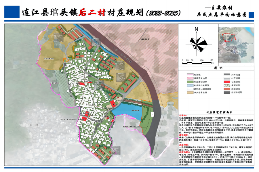 住宅建筑前后间距与建筑高度比一般不低于1:1,相邻房屋山墙之间(外墙至外墙)的间距不低于4米,建筑宜朝南、朝南偏东或偏西布置。新建建筑后退村庄干路红线不宜小于3米,后退村庄支路红线不宜小于1米。因旧房改造、扩建等受用地条件限制的,根据实际情况由琯头镇人民政府合理确定相邻距离。