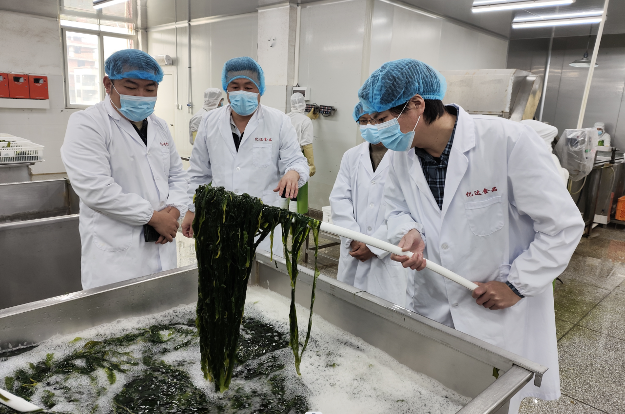 调研组一行首先前往福建亿达食品有限公司,同企业负责人交流公司海带产品种养、加工、创新、推广等情况,并深入海带车间加工生产线,向车间组长详细了解海带加工技艺,通过翻阅生产记录材料,认真核对加工用水、用盐等满足绿色食品相关指标。随后前往该公司位于筱埕镇官坞村的海带生产海域,在海上实地查看亿达公司海带养殖基地,听取业务经理介绍我县海域海水养殖海带营养价值优势、海带苗品种特性、新投放海带苗生长等情况。