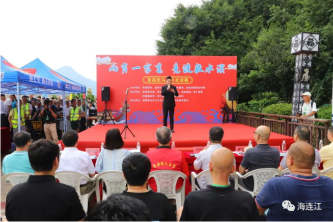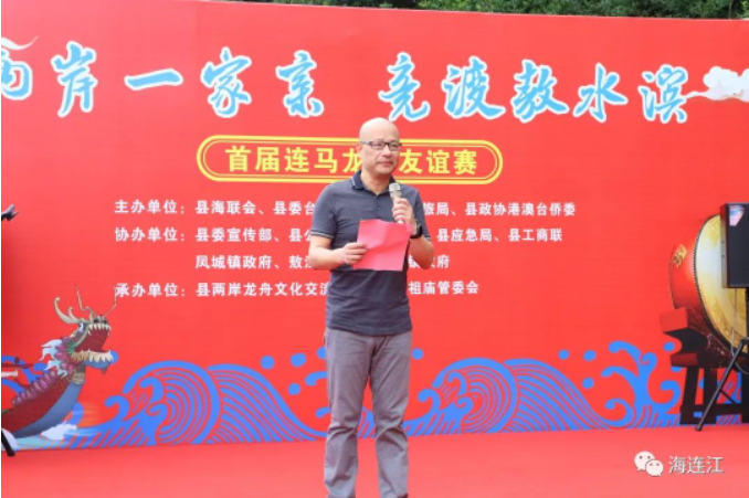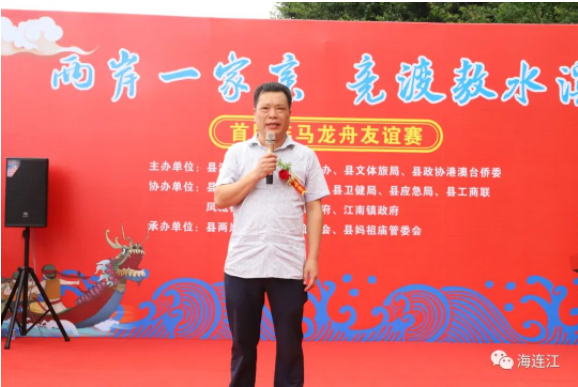 ▲活动现场,县委常委、统战部部长俞传华宣布“两岸一家亲 竞渡敖水滨”首届连马龙舟友谊赛正式开幕。