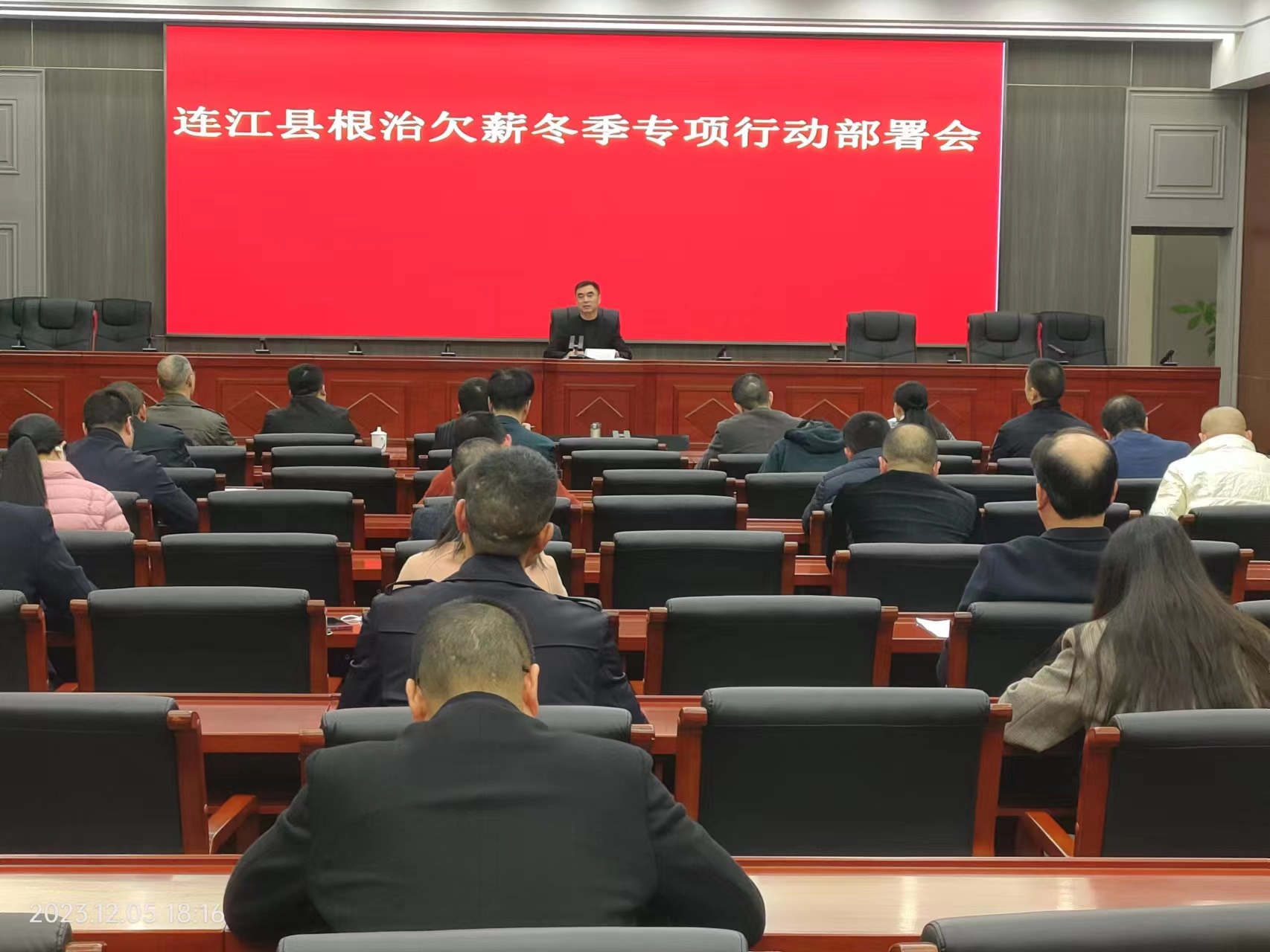 为有力有序有效做好岁末年初保障农民工工资支付工作,切实维护农民工工资报酬权益,12月5日下午,全省召开深化根治欠薪工作交流会暨冬季专项行动动员部署电视电话会议,连江县设分会场收听收看。县委常委、副县长吴思斌在连江县分会场听会并部署连江县具体工作。根治拖欠农民工工资工作领导小组成员单位分管领导,各开发区、指挥部、相关国企单位负责同志及县人社局主要领导、分管领导参加会议。