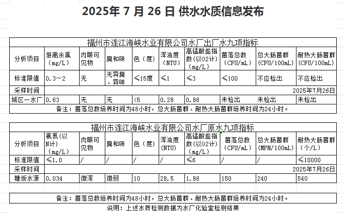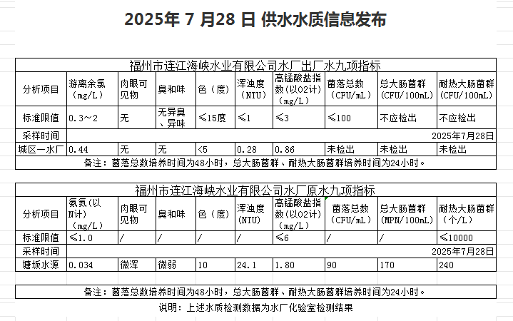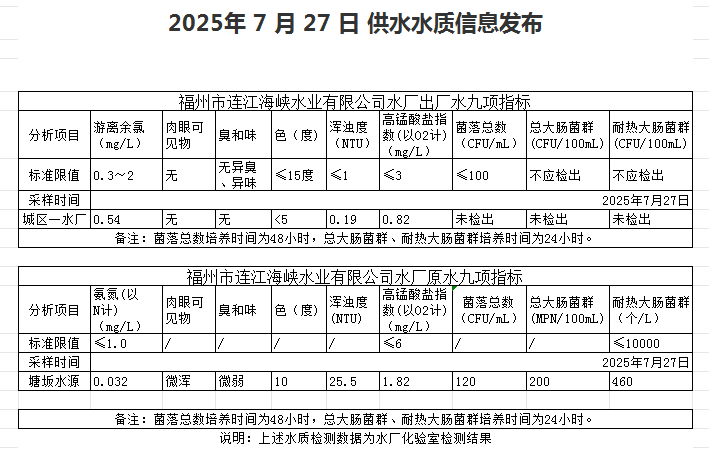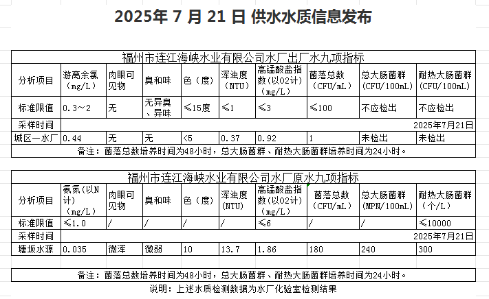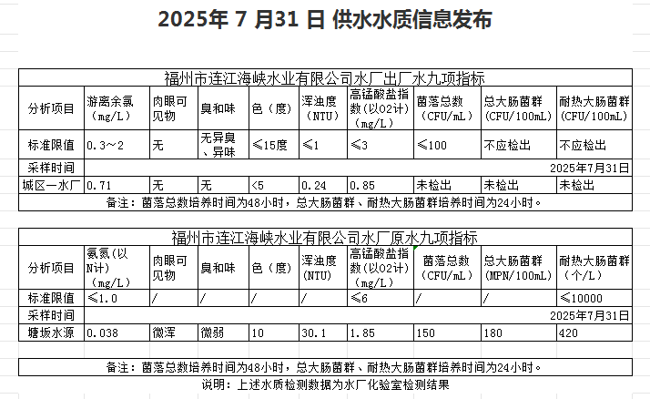 2025年7月21日-7月31日 供水水质信息发布