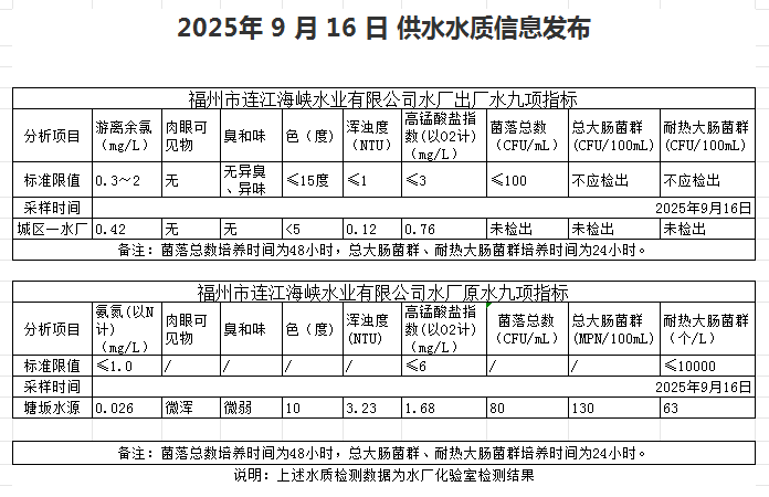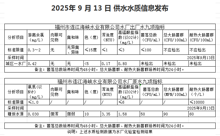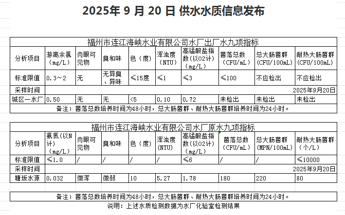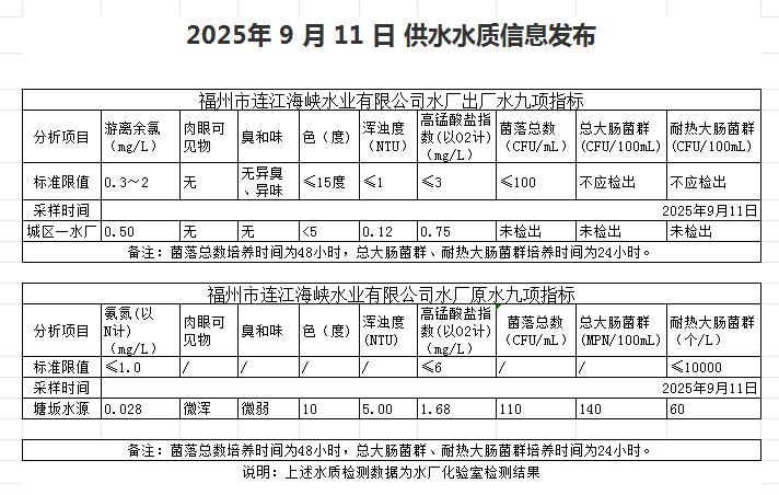 2025年9月11日-9月20日 供水水质信息发布