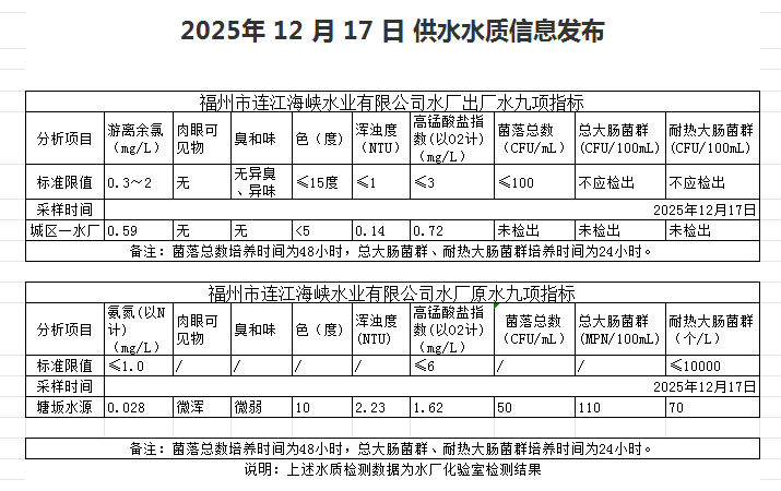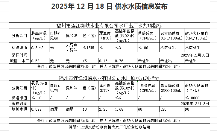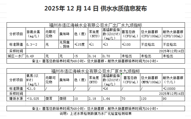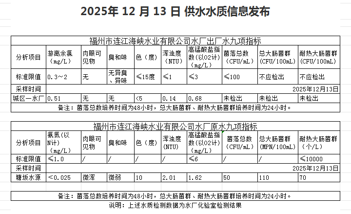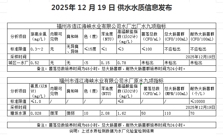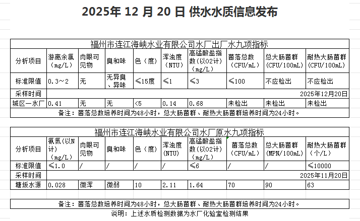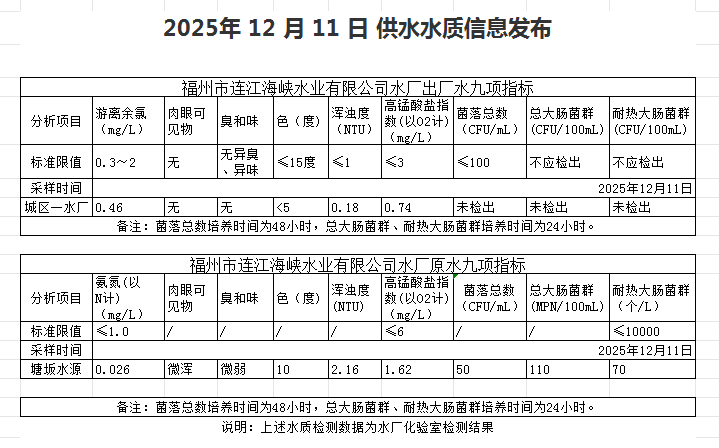 2025年12月11日-12月20日 供水水质信息发布