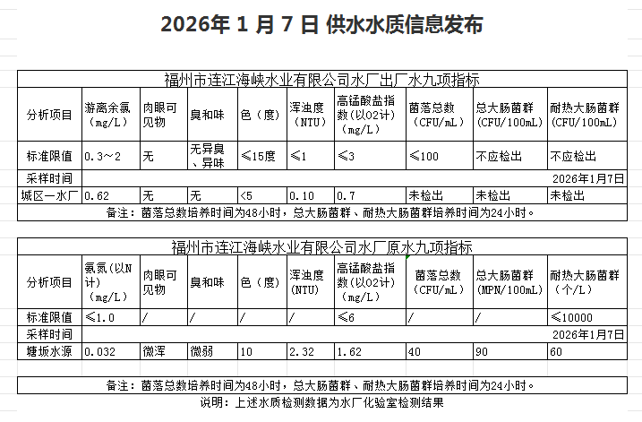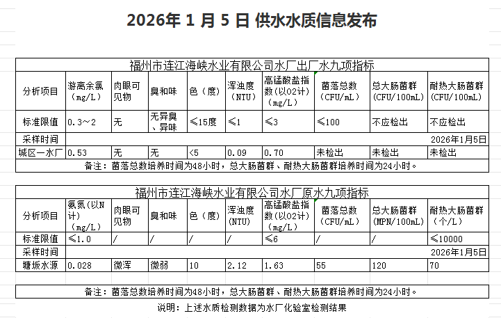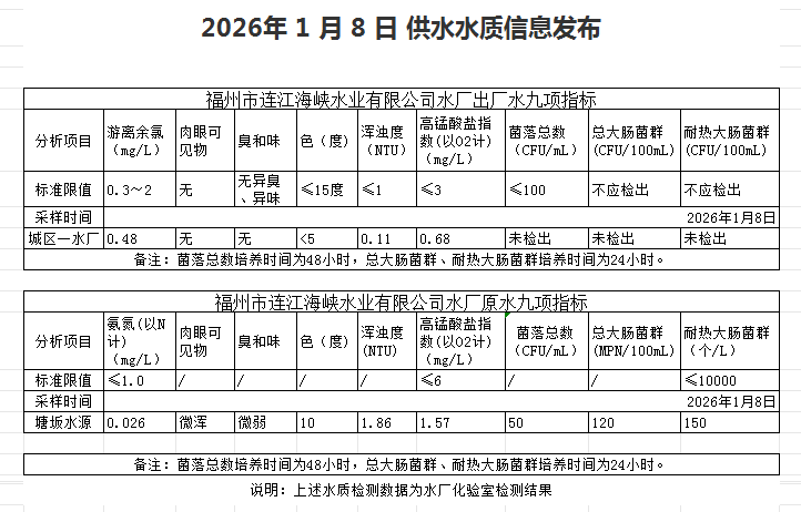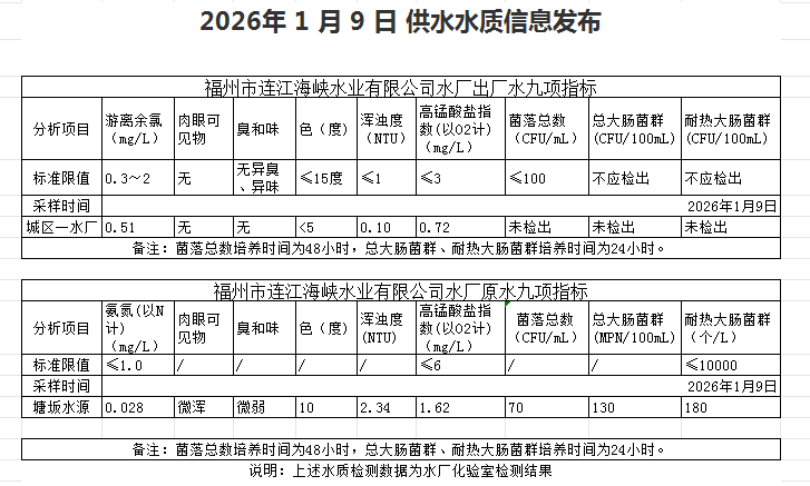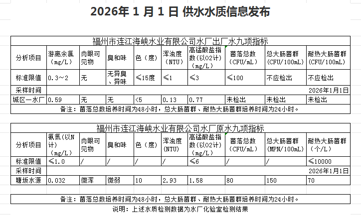 2026年1月1日-1月10日 供水水质信息发布