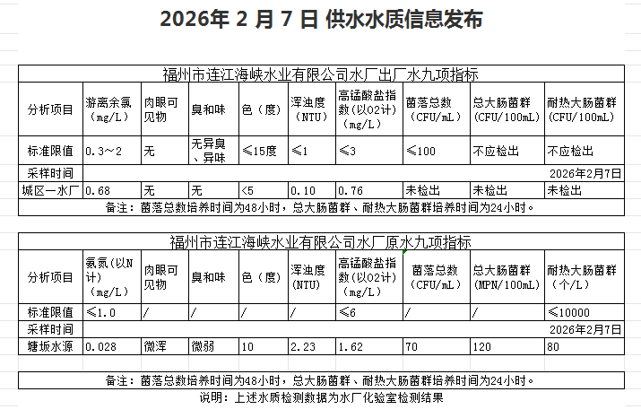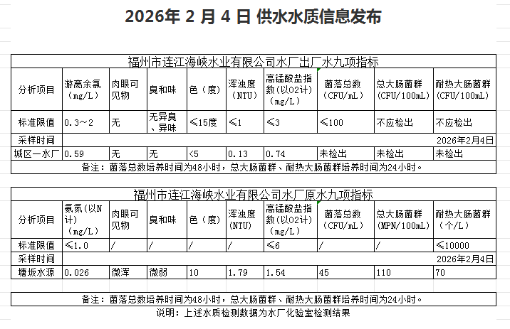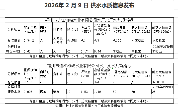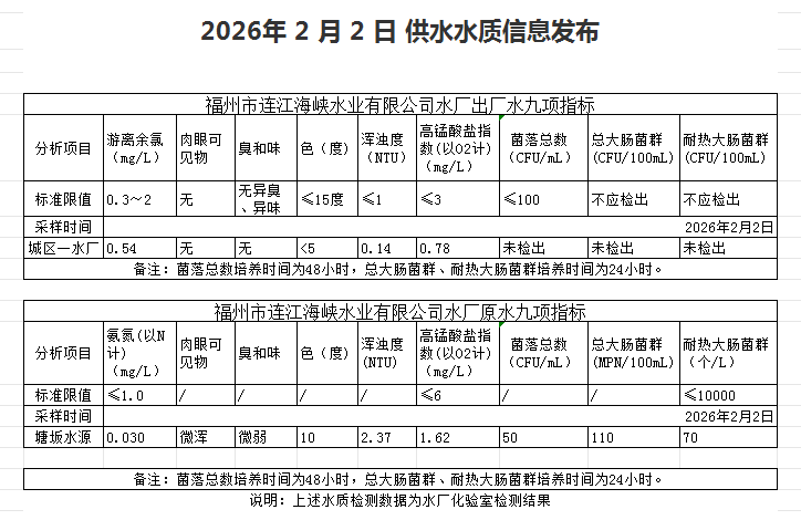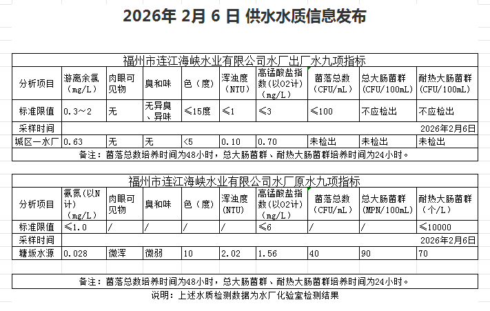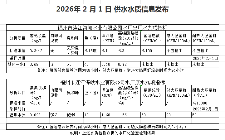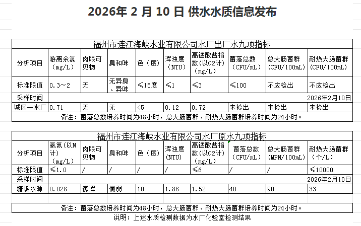 2026年2月1日-2月10日 供水水质信息发布