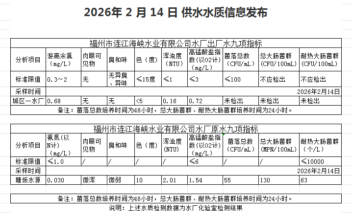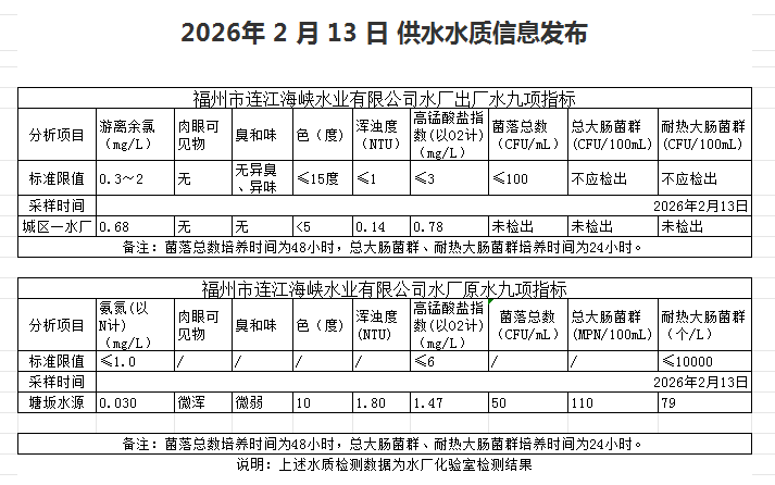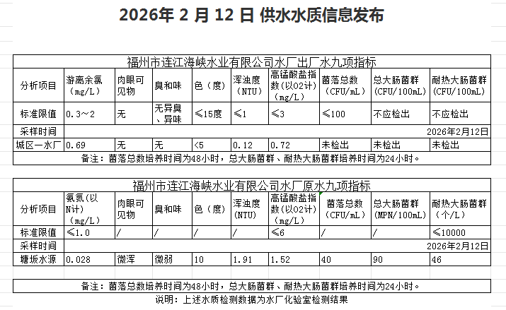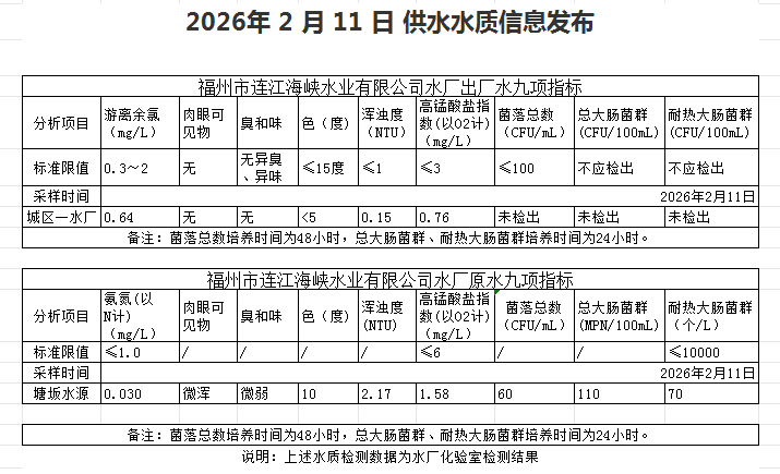 2026年2月11日-2月20日 供水水质信息发布