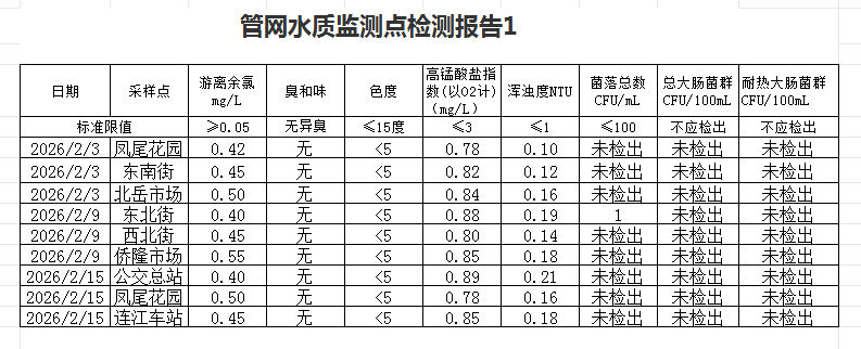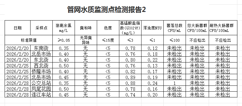 2026年2月管网水和末梢水水质监测点检测报告