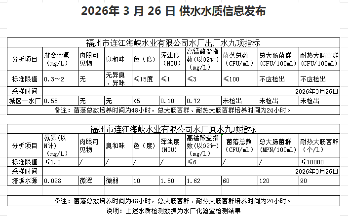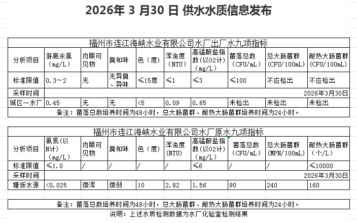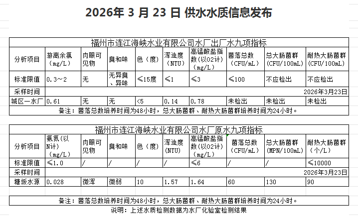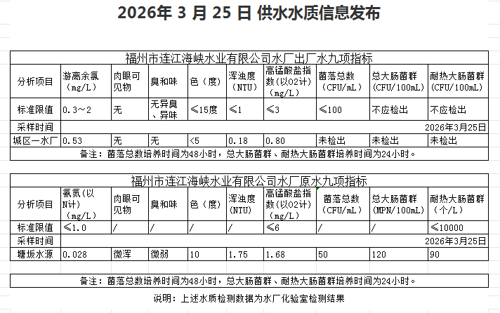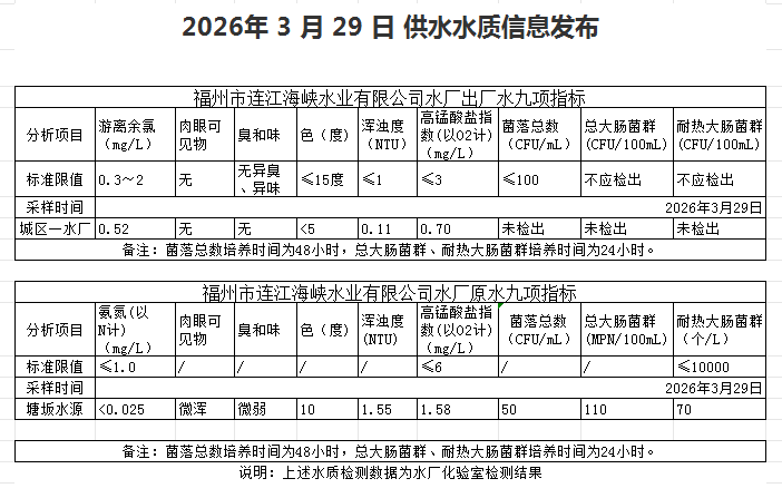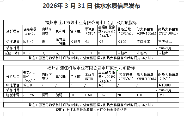 2026年3月21日-3月31日 供水水质信息发布