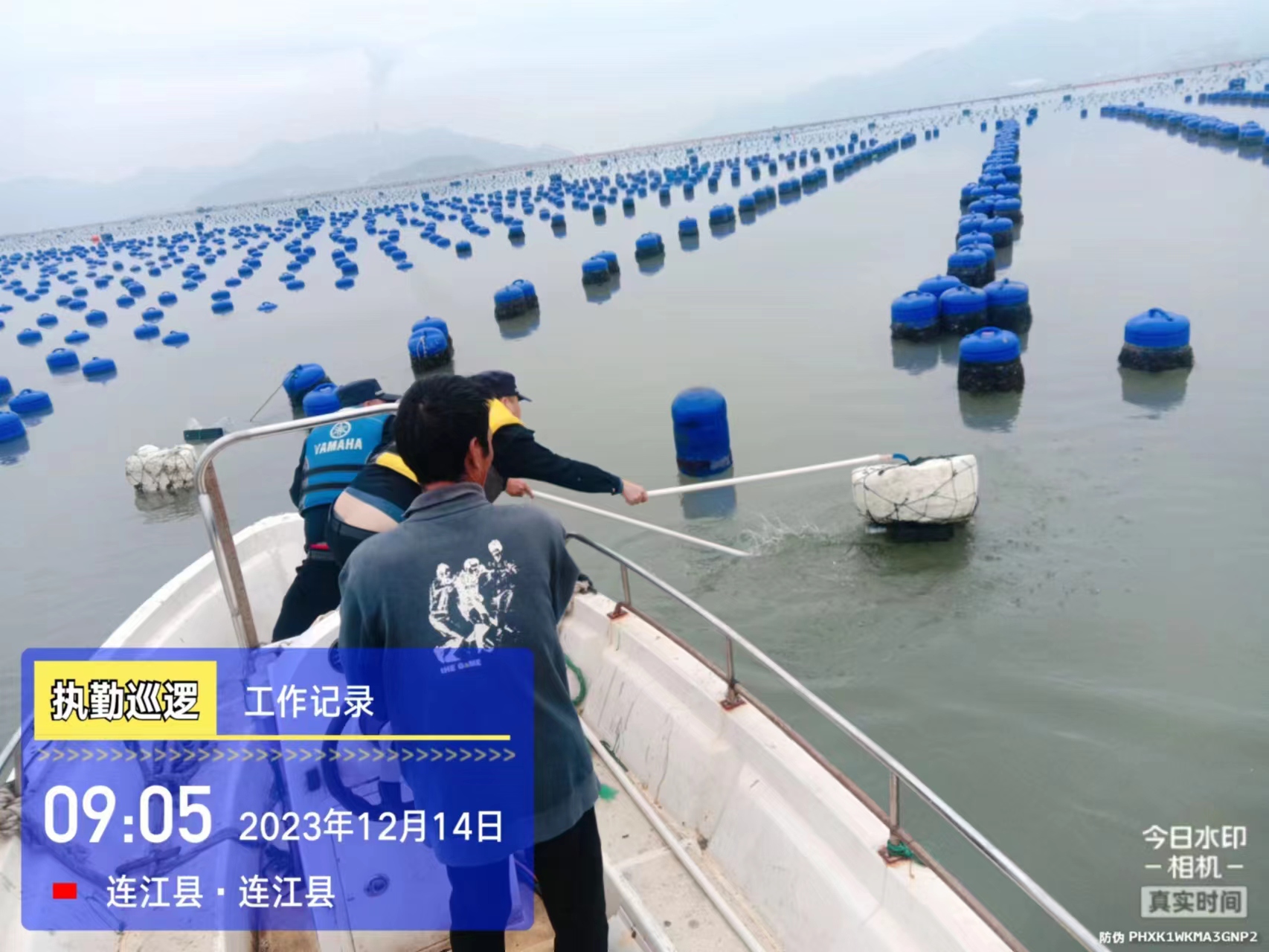 12月14日,坑园镇执法队在海上持续开展白色浮球清理工作。